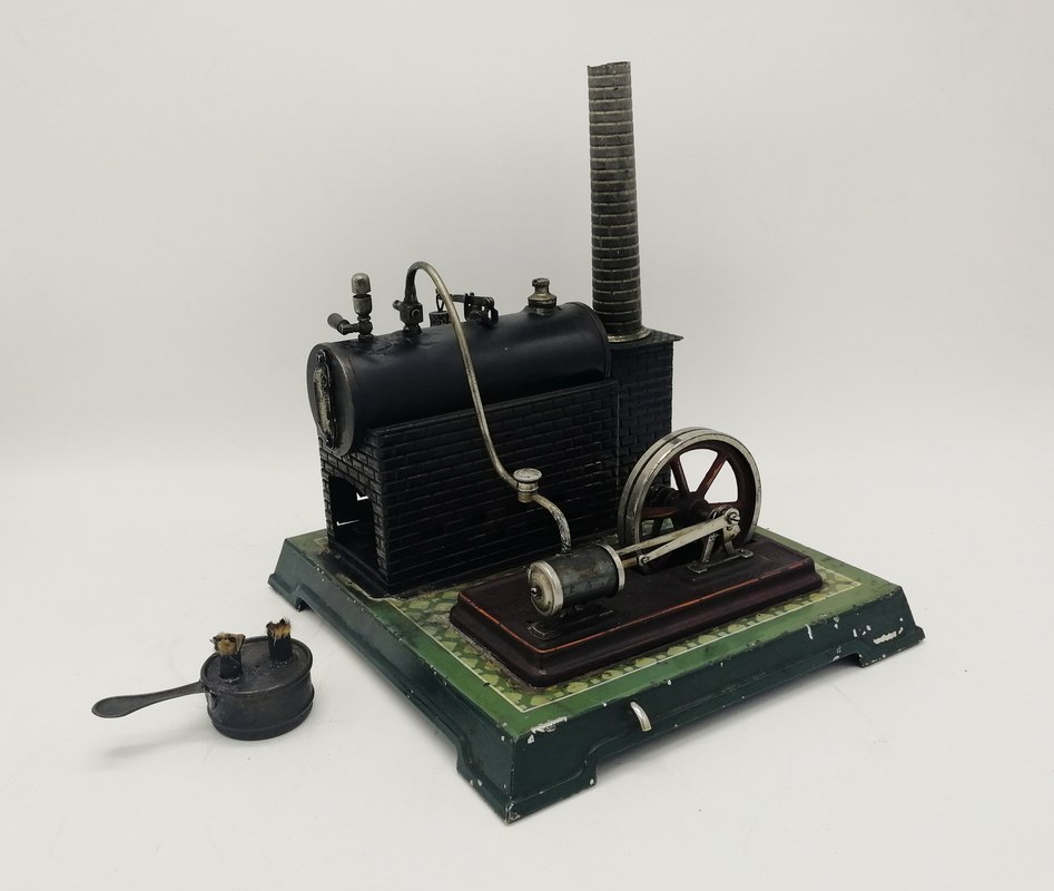 На нашем сайте представлена модель паровой машины – иными словами, уменьшенный агрегат, демонстрационного характера, не предназначенный для серьезной работы. Этот экземпляр выпускался в 1920-1940х годах широко известной фирмой Märklin в Германии.