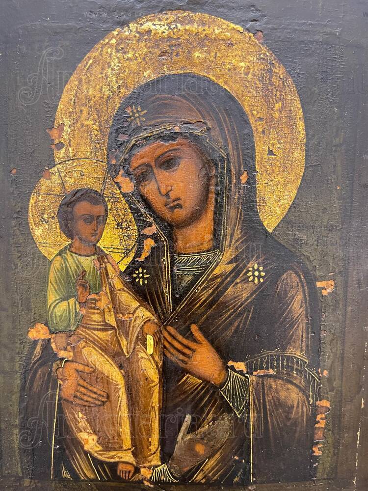 Иконография Троеручицы восходит к средневековому преданию о чудесном исцелении преподобного Иоанна Дамаскина, которому была приставлена отсечённая рука молитвами перед образом Богоматери. В благодарность к иконе была приложена серебряная рука, давшая название этому изводу. На Руси почитание Троеручицы получило широкое распространение с XVII века, когда список чудотворного образа был принесён в Москву сербскими монахами. В XIX столетии этот иконографический тип стал одним из наиболее популярных в домашнем благочестии, к Троеручице обращались с молитвами об исцелении болезней рук, о помощи в рукоделии и всяком ручном труде. Центральная Россия в XIX веке была центром производства икон для широкого распространения — мастерские Москвы, Мстёры, Палеха и других иконописных центров создавали образы для церквей и домашних иконостасов по всей империи. Иконы этого времени отличаются разнообразием художественных решений — от строгих академических образцов до народных провинциальных интерпретаций. Данный памятник относится к традиционному направлению, сохраняющему связь с древнерусской иконописной школой через тёмный колорит, уплощённость форм и строгость композиции. Отсутствие реставрационных вмешательств делает эту икону особенно ценной для понимания подлинного состояния памятников XIX века, большинство которых подвергались многократным расчисткам и записям. Для коллекционеров религиозного искусства такие нереставрированные образы представляют редкую возможность приобретения подлинного свидетельства духовной культуры императорской России.