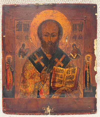 Владимирские иконописные сёла — Палех, Мстёра и Холуй — составляли в девятнадцатом веке один из важнейших центров производства православных икон в Российской империи. Эти мастерские обеспечивали потребности не только местных приходов, но и поставляли иконы по всей России, от крестьянских домов до купеческих особняков. Иконописцы владимирских сёл прошли многовековую школу мастерства, восходящую к традициям древнерусской живописи, сохраняя при этом характерные технические приёмы и иконографические изводы. Особенностью владимирской школы являлось сочетание строгой каноничности композиций с тонкостью письма и богатством декоративного оформления. Святитель Николай почитался на Руси как один из наиболее чтимых святых, покровитель путешественников, моряков, торговцев и земледельцев, поэтому иконы с его изображением присутствовали практически в каждом православном доме. Предстоящие Константин и Елена, обретшие Животворящий Крест Господень, добавляли иконе дополнительную символику защиты и покровительства. Подобные трёхфигурные композиции пользовались популярностью в провинциальном благочестии как семейные моленные образы. На современном антикварном рынке владимирские иконы девятнадцатого века представляют устойчивый интерес коллекционеров благодаря высокому техническому уровню исполнения и исторической значимости этой иконописной традиции. Нереставрированные экземпляры под родной олифой ценятся особенно высоко, поскольку демонстрируют подлинную технологию и материалы эпохи без позднейших наслоений.