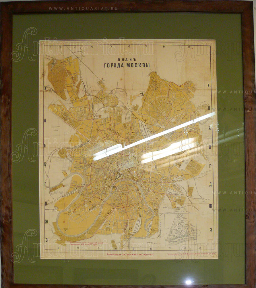 Карта сохранила характерные для подлинных отпечатков начала XX века признаки естественного старения бумажной основы и типографских красок. Литографский оттиск демонстрирует аутентичную патину времени, типичную для картографических материалов столетней давности. Сохранность изображения позволяет различать планировочную структуру Москвы того периода, включая радиально-кольцевую систему улиц, границы исторических районов и расположение значимых архитектурных объектов. Отсутствие позднейших реставрационных вмешательств подтверждает подлинность экземпляра и его происхождение из частного собрания, где план хранился в рамном оформлении.