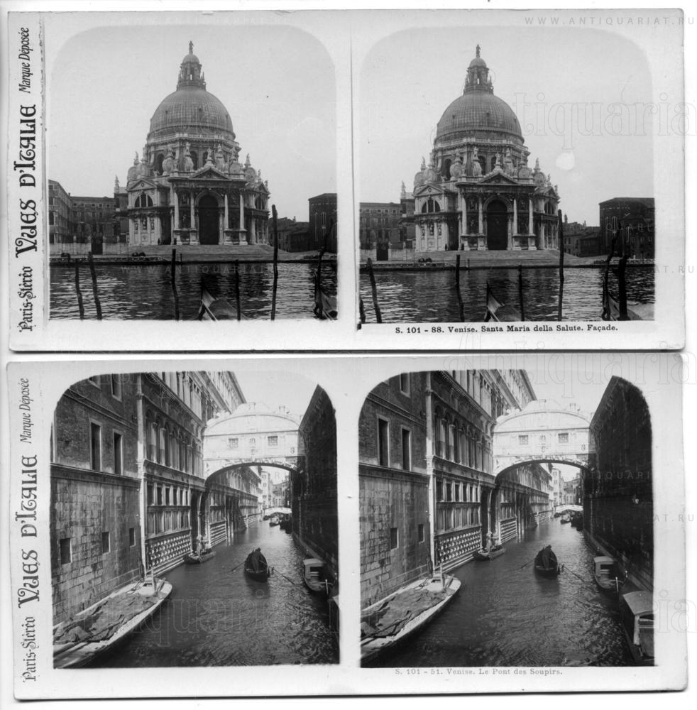 В комплект входит 8 стереопар с видами Венеции конца 19 - начала 20 века.