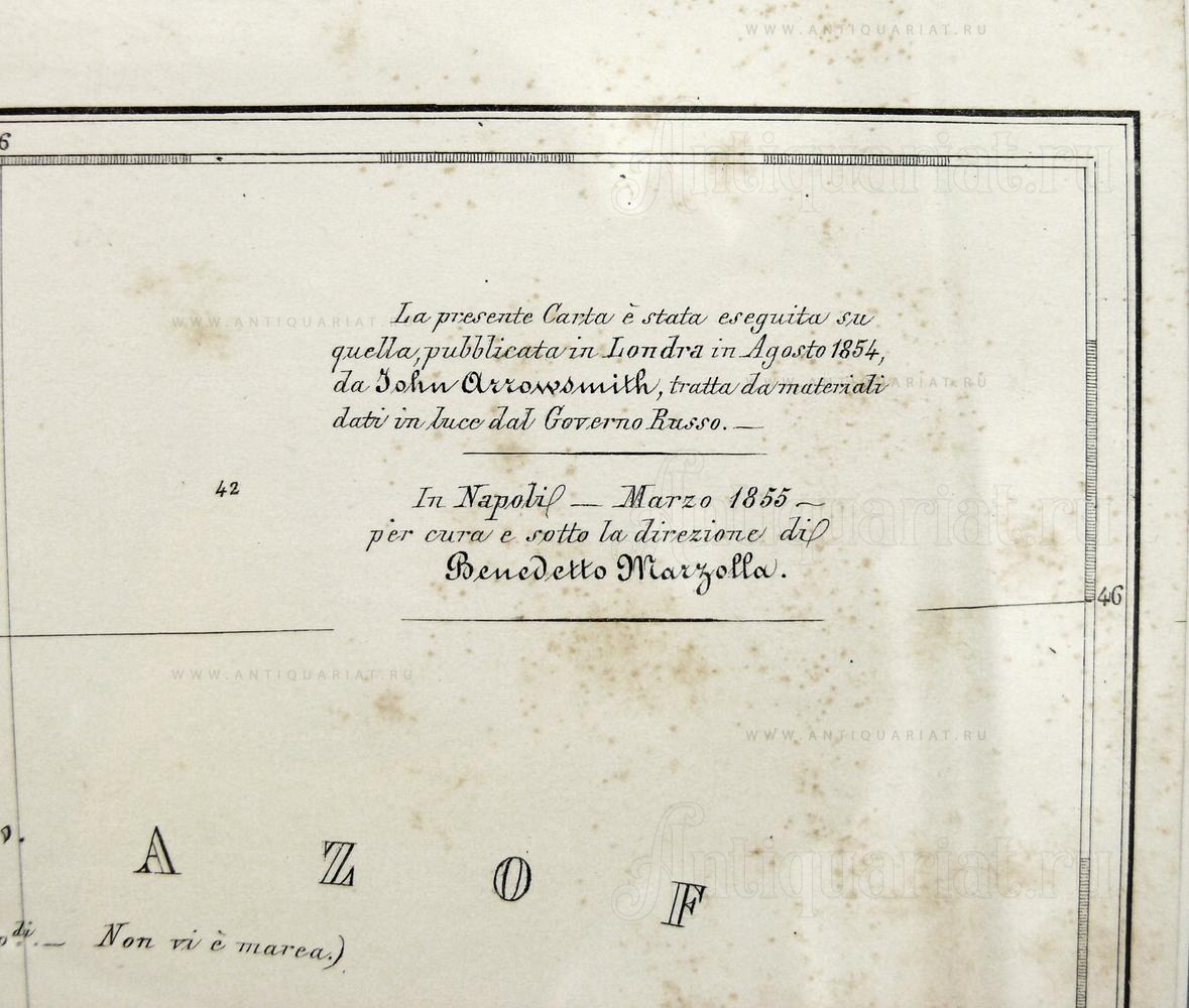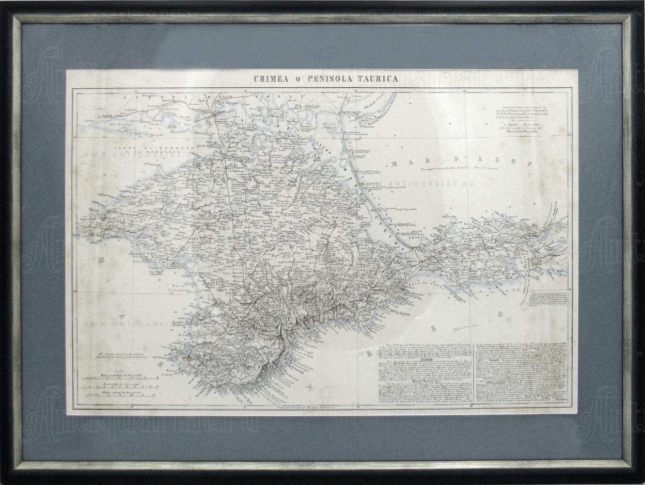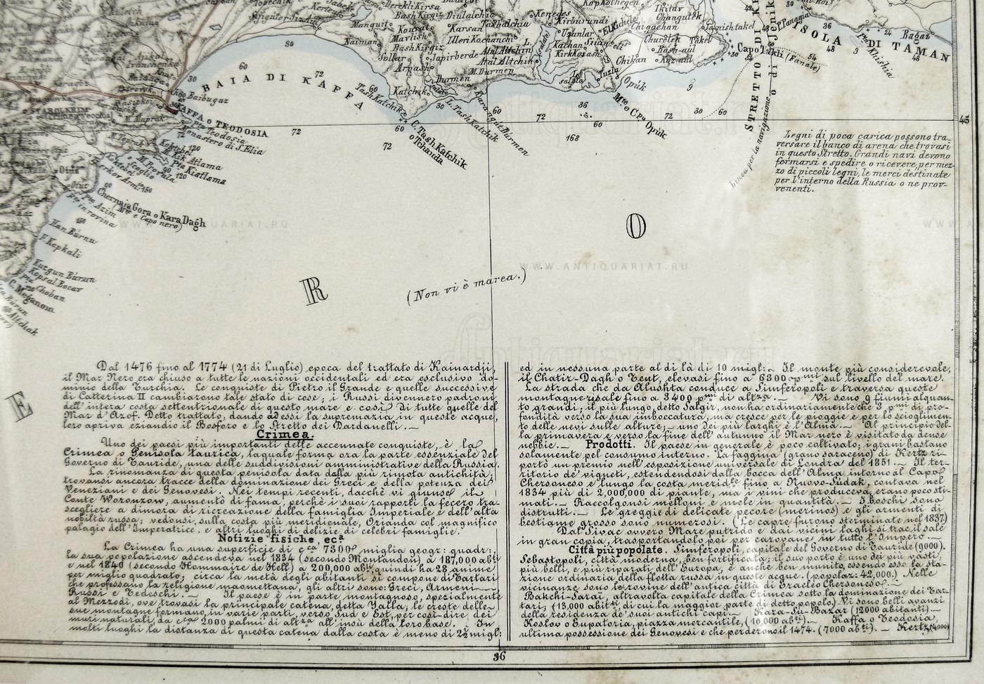 Изданная во время Крымской войны (1853-56 гг.), эта подробная итальянская карта охватывает полуостров с впечатляющими деталями. Она включает сложные топографические детали, множество географических названий, дороги, глубинные промеры и примечания на итальянском языке, содержащие информацию о регионе. В примечании вверху справа указано, что источником является карта Джона Эрроусмита 1854 года.