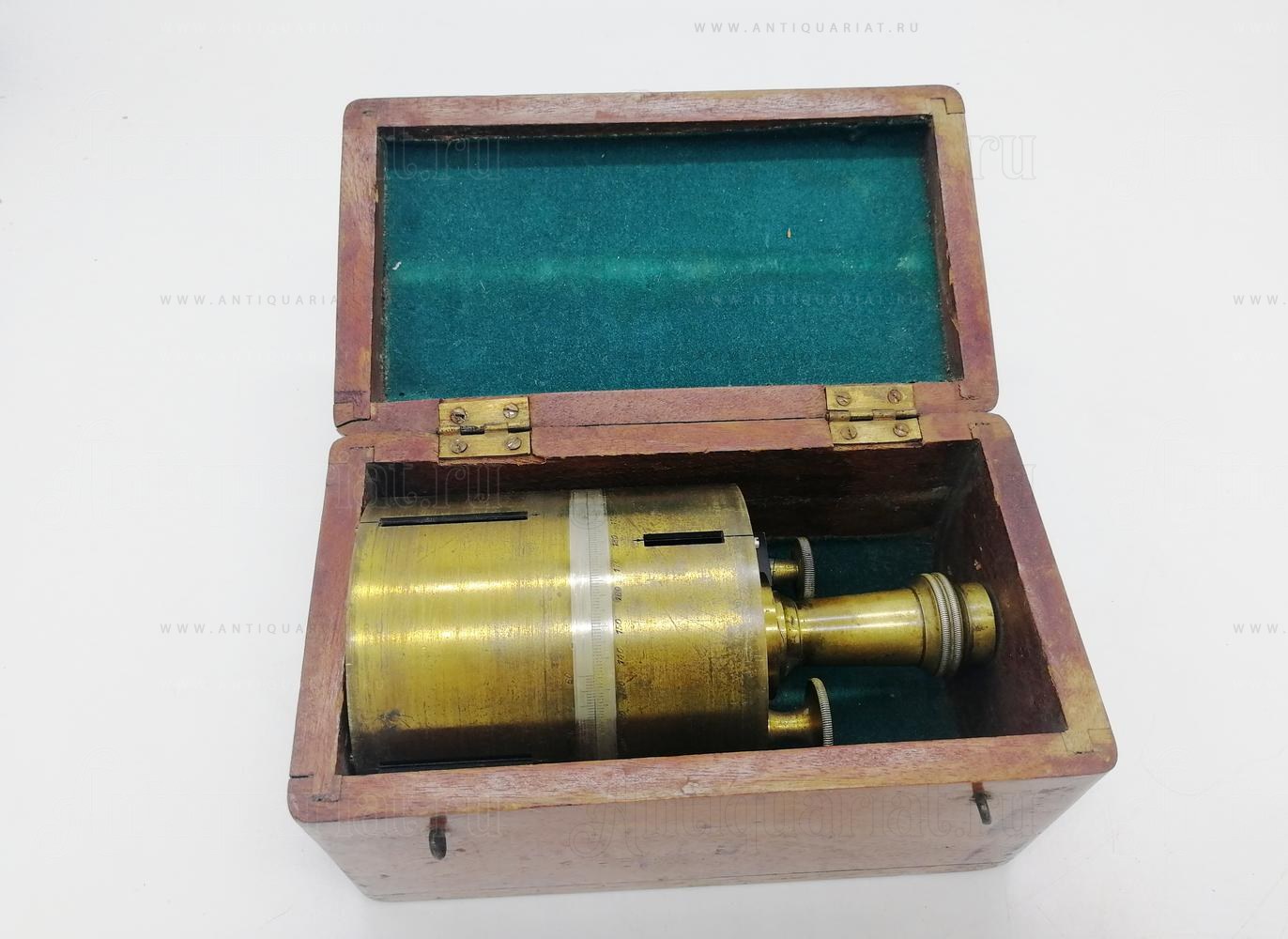 Геодезический прибор позволяет производить измерение и разбивку на произвольные углы (аналогично землемерной астролябии). Прибор в оригинальном футляре красного дерева, без повреждений и хорошей сохранности. Указаны внешние размеры футляра.