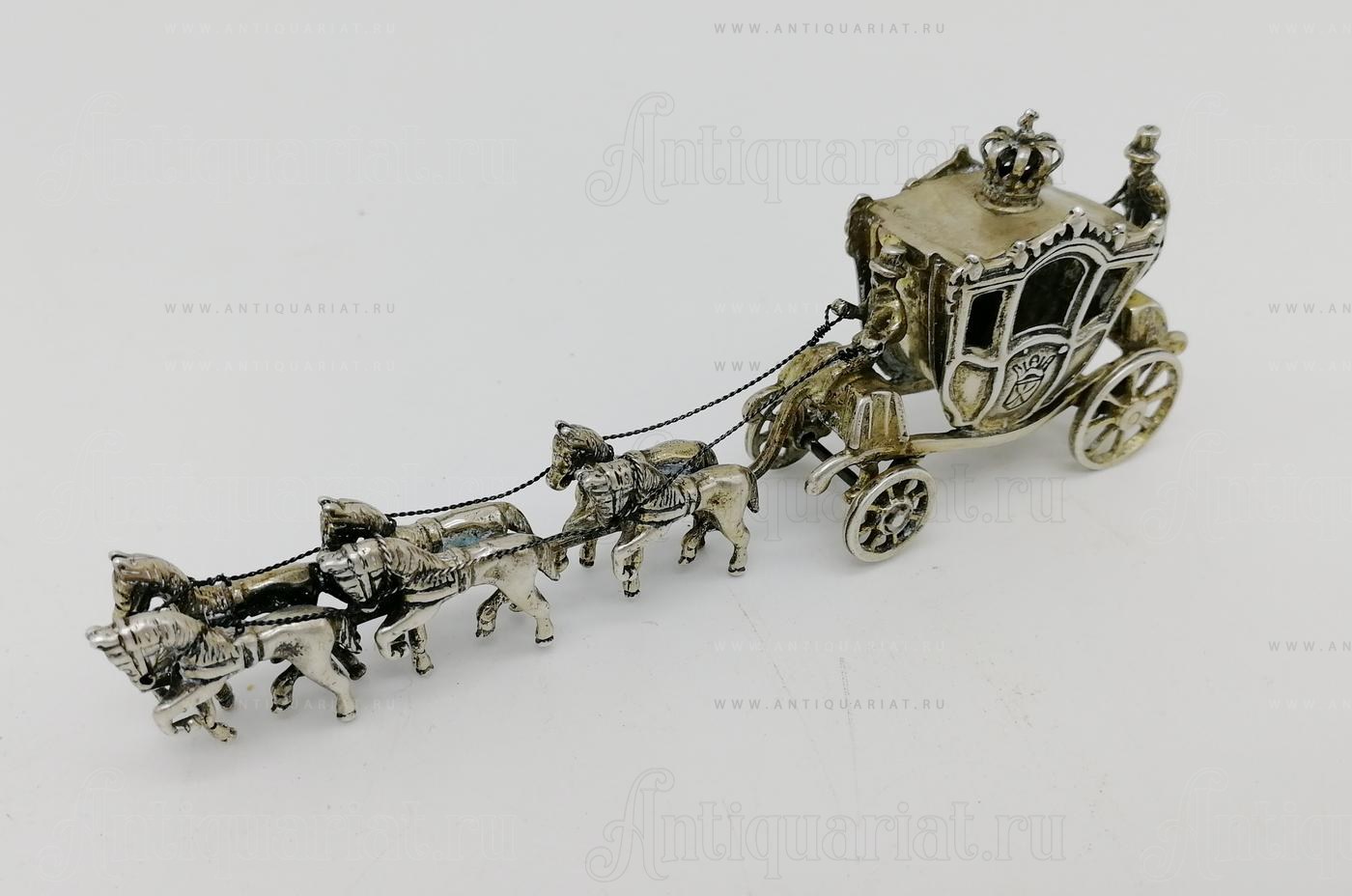 Миниатюра выполнена из серебра и изображает королевскую карету запряжённую шестёркой лошадей
