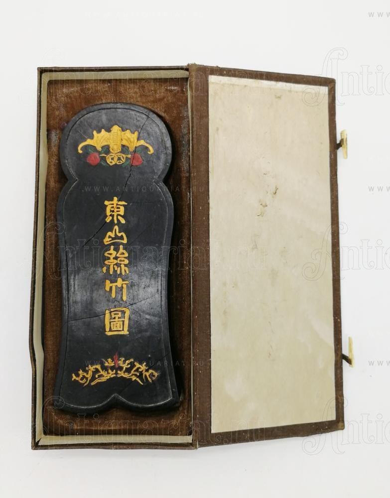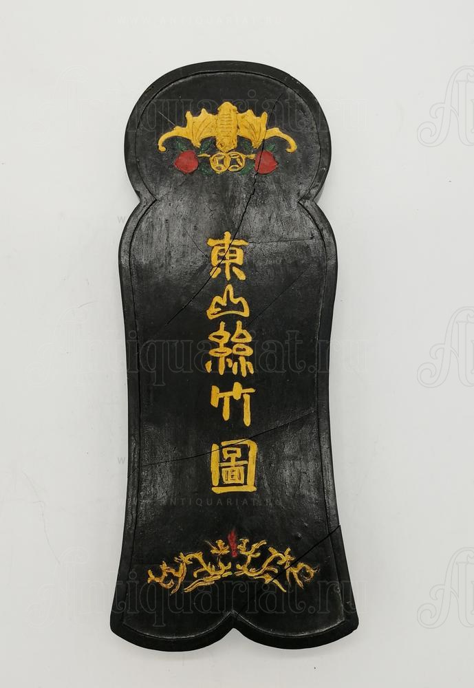 На обратной стороне бруска контр рельефная надпись (東山絲竹圖) раскрашенная золотом и означающая - Картина "Музыка восточной горы".