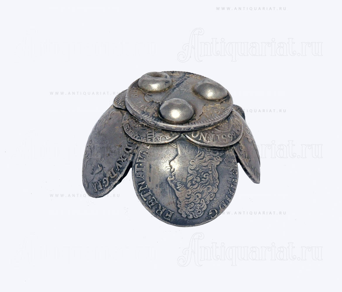 Пепельница изготовлена из серебряных монет достоинством в 1 экю, выпущенных в период правления Людовика XIV, XV, XVI. Самая поздняя из них датирована 1789 годом (Великая Французская революция) на ней с одной стороны изображен портрет Людовика XVI, с другой стороны же, - символов монархии нет!