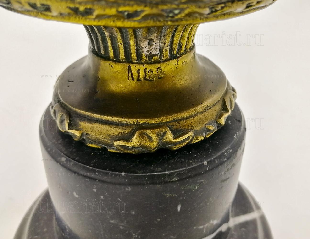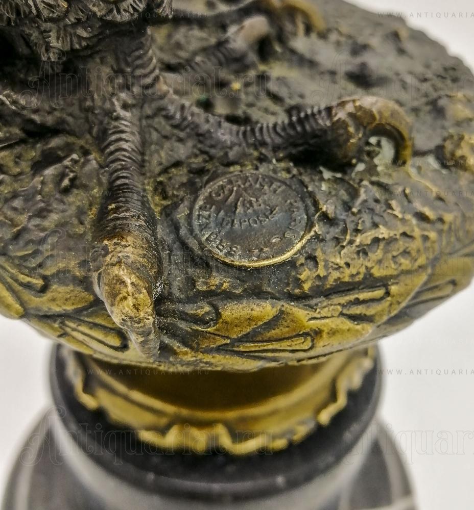Скульптура изготовлена из бронзы и установлена на массивном мраморном основании. Качество исполнения подтверждается клеймом в виде медальона с надписью «BRONZE GARANTI PARIS DEPOSÉE», что свидетельствует о подлинности материала и происхождении из Франции. Наличие серийного номера «1122» на основании указывает на ограниченный выпуск и повышает коллекционную ценность изделия.
