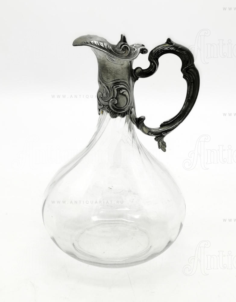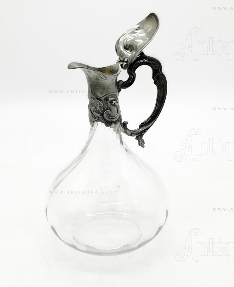 Декантер изготовлен из прозрачного стекла, горлышко и ручка выполнены из шпиатра декорированных рокальными орнаметами. Горлышко с откидной изогнутой крышечкой сделано из шпиатра и украшено рельефными завитками. Декантер изготовлен в Бельгии в ХIХ в. Он станет отличным подарком ценителю вин. Прозрачное стекло позволит оценить цвет напитка, а приподняв крышечку, можно насладиться его запахом