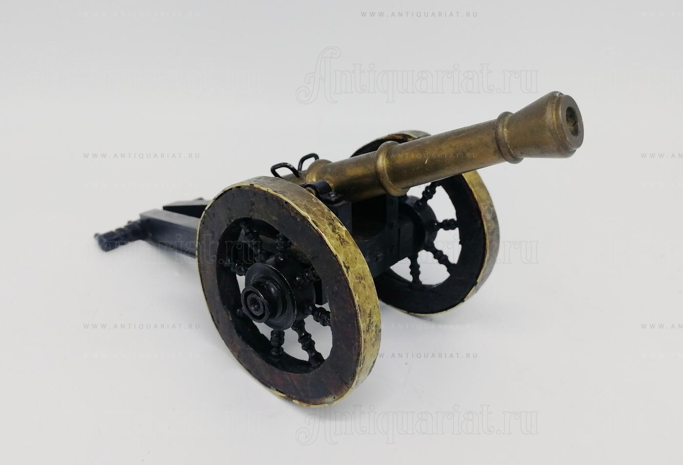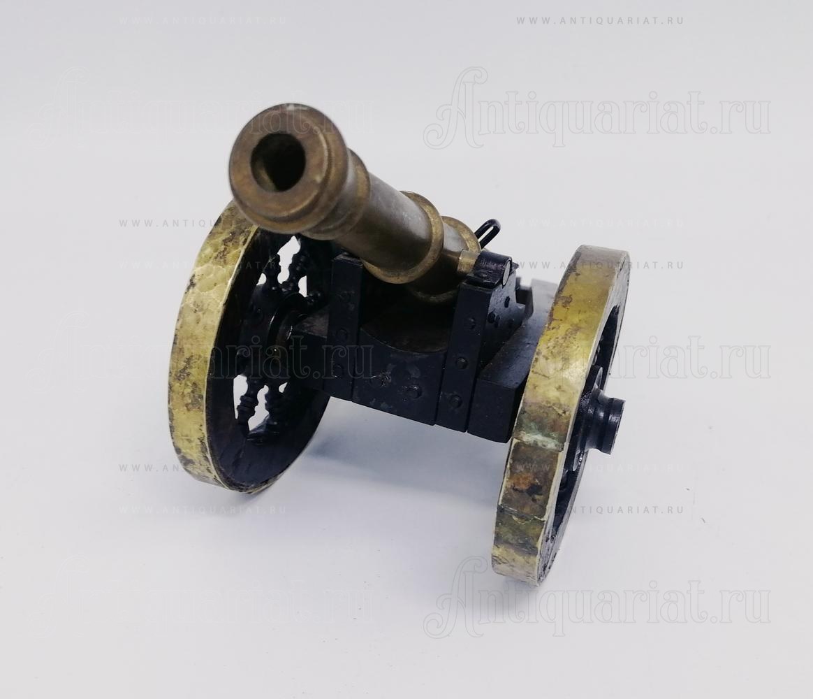 Данный экземпляр выделяется сочетанием благородной бронзовой патины, тщательно проработанного силуэта лафета и конструктивных элементов (лафет из стали, деревянные колёса с бронзовой оковкой), что создаёт убедительный исторический образ артиллерийского орудия. Как предмет середины XX века, он представляет интерес не только как декоративный объект, но и как свидетель устойчивого культурного интереса к военно-исторической тематике в послевоенный период. Это делает модель привлекательной для частных коллекций и интерьерных решений с акцентом на историческую и военно-морскую символику.