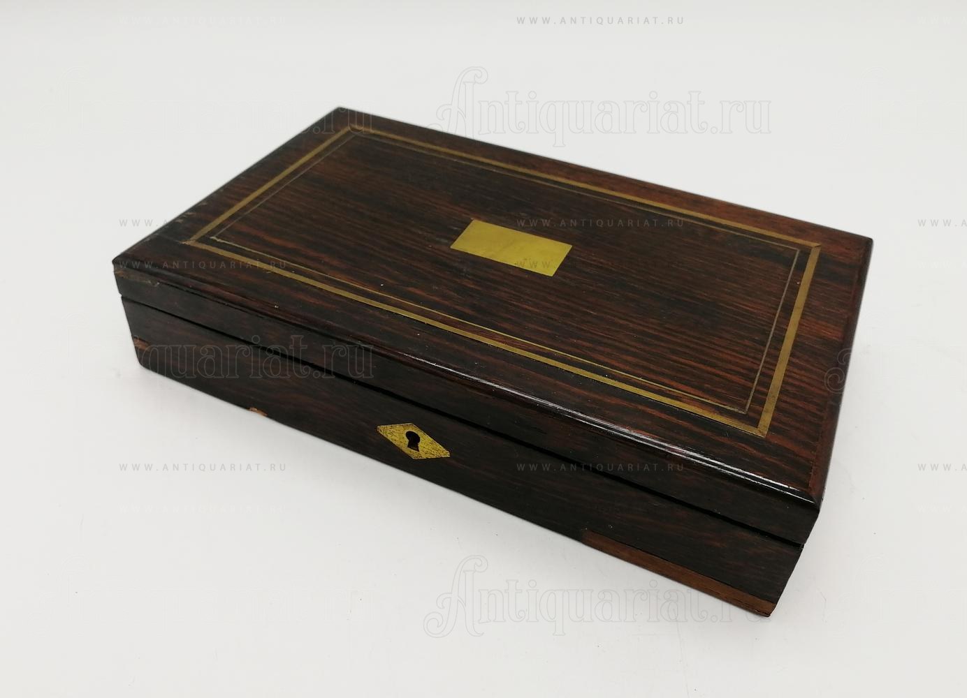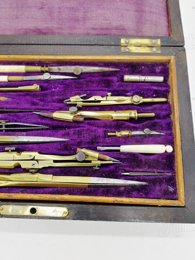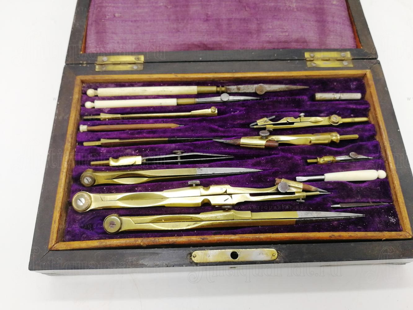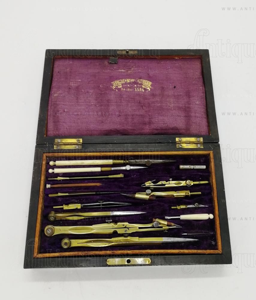 Инструменты выполнены из бронзового сплава, рабочие части стальные. Хватки на рейсфедере и отвёртке из слоновой кости. Футляр облицован палисандром и инкрустирован бронзовыми вставками. Ключ от футляра утрачен.
