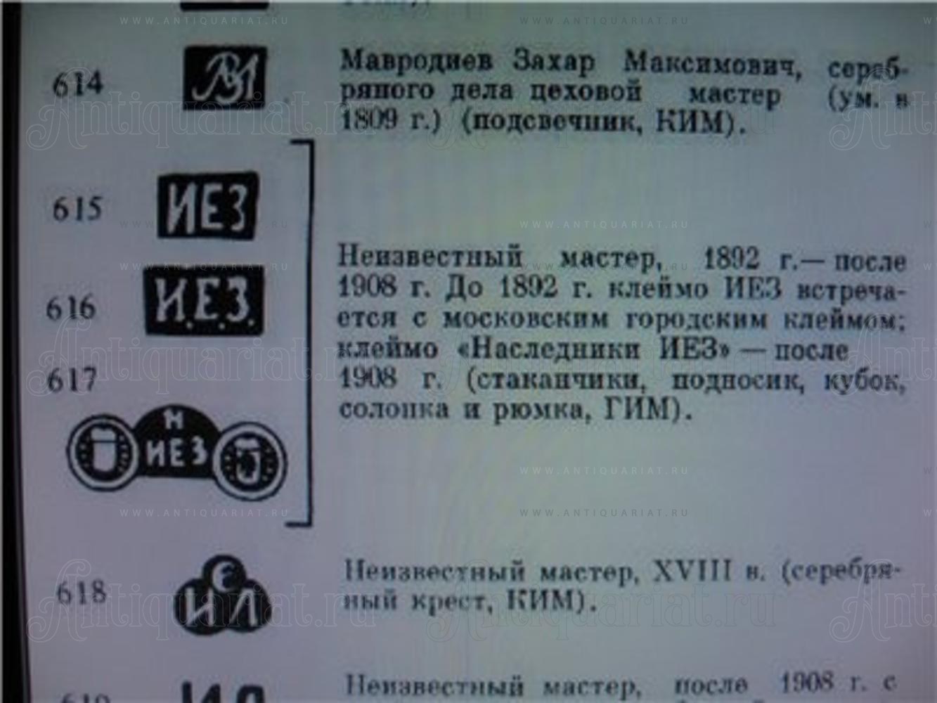Клеймо "ИЕЗ" - неизвестный мастер, до 1892 часто встречается с московским городским клеймом