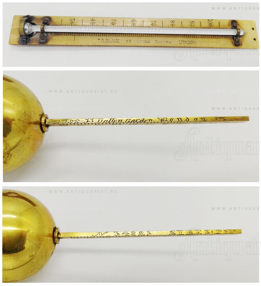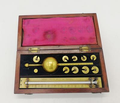 Прибор имеет № 34885. Все веса и поплавок ареометра индивидуально маркированы указанным номером, доказывая, что комплект является оригинальным и полным. Набор укомплектован ртутным термометром закреплённым на пластине из кости с гравировкой имени производителя (находится в исправном состоянии).
