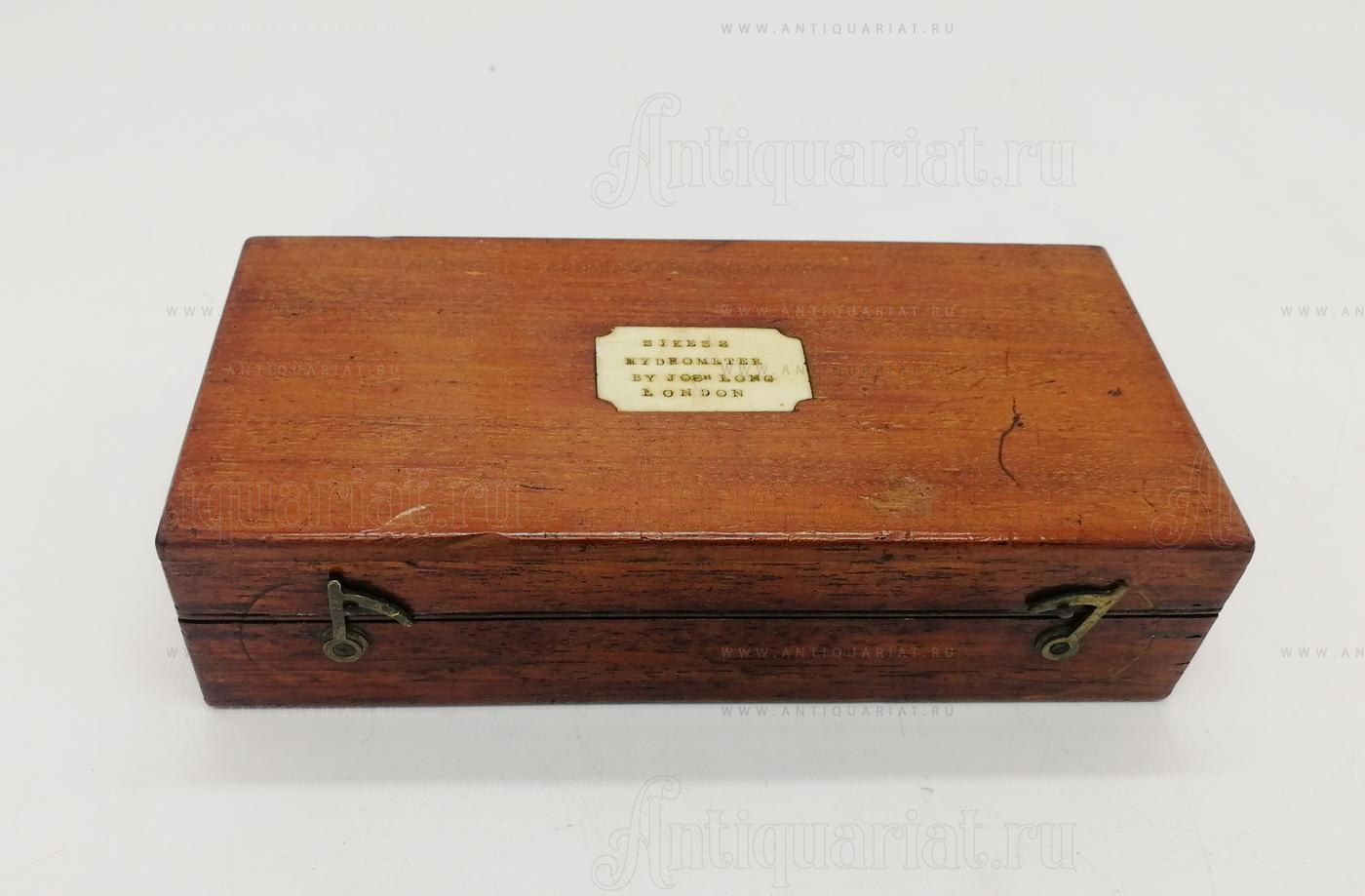 Комплект размещён в красивом футляре из красного дерева (махагон) с шелковой подкладкой и бархатной подкладкой с незначительными потёртостями характерными возрасту предмета. На внешней стороне крышки футляра имеется табличка из кости с гравировкой "SIKES`S HYDEROMETER BY JOSᴴ LONG LONDON"