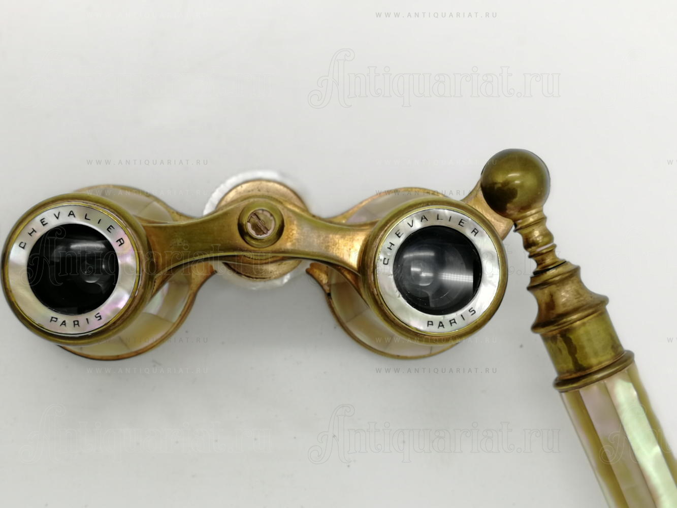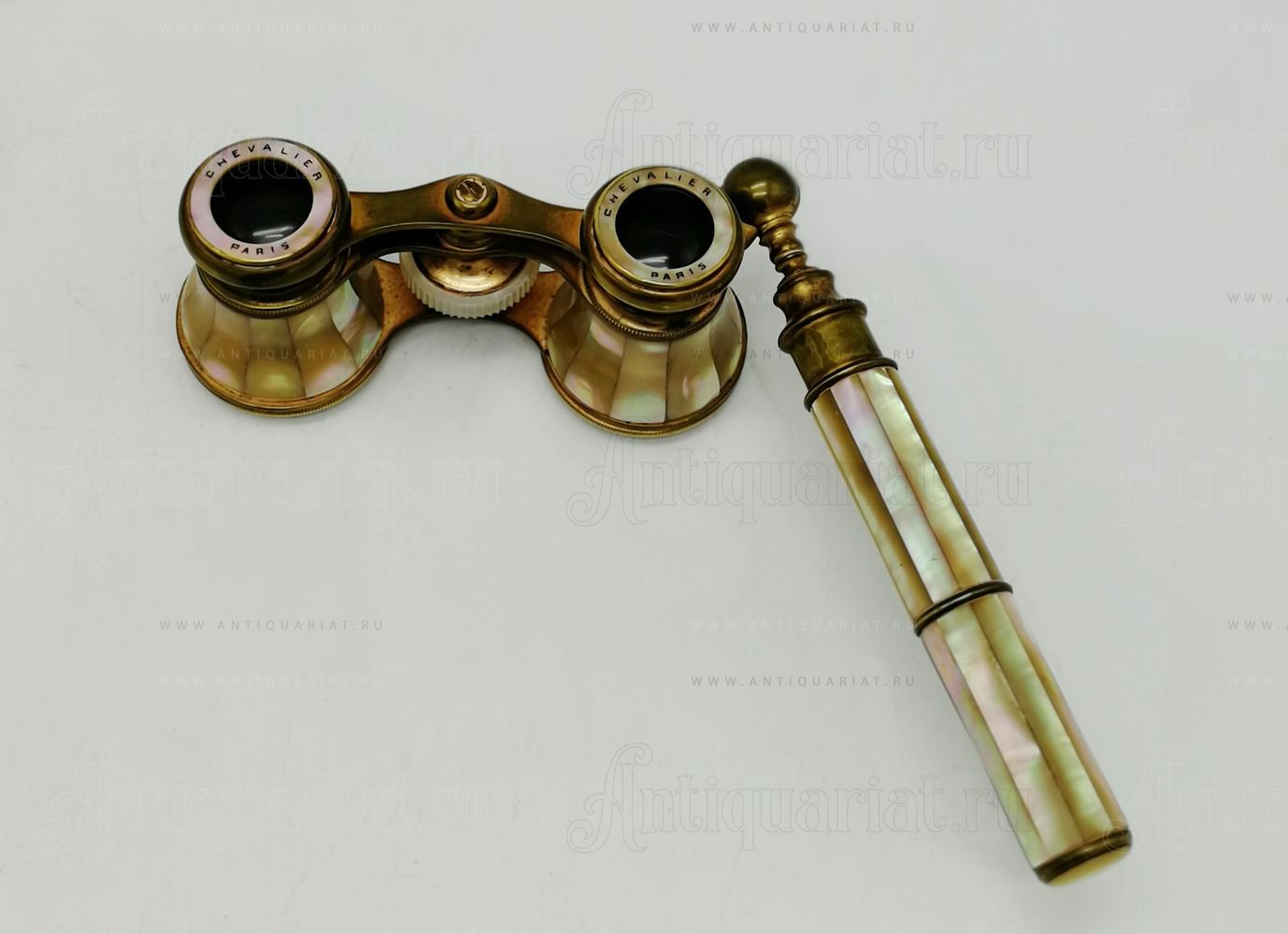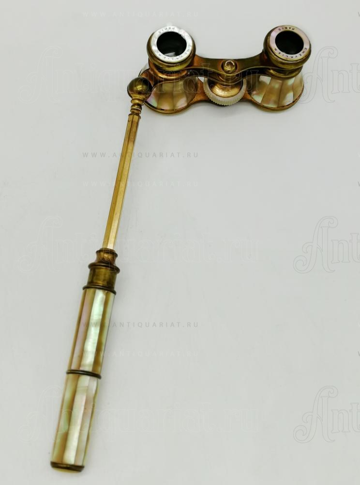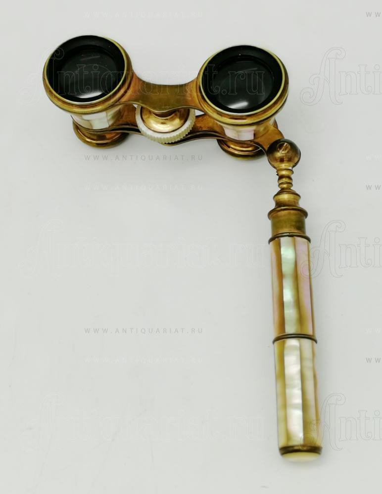Бинокль декарирован накладками из перламутра. Телескопическая ручка позволяет более комфортно использовать прибор. Оптика чистая. в исправном состоянии. сколов и трещин на перламутре нет.