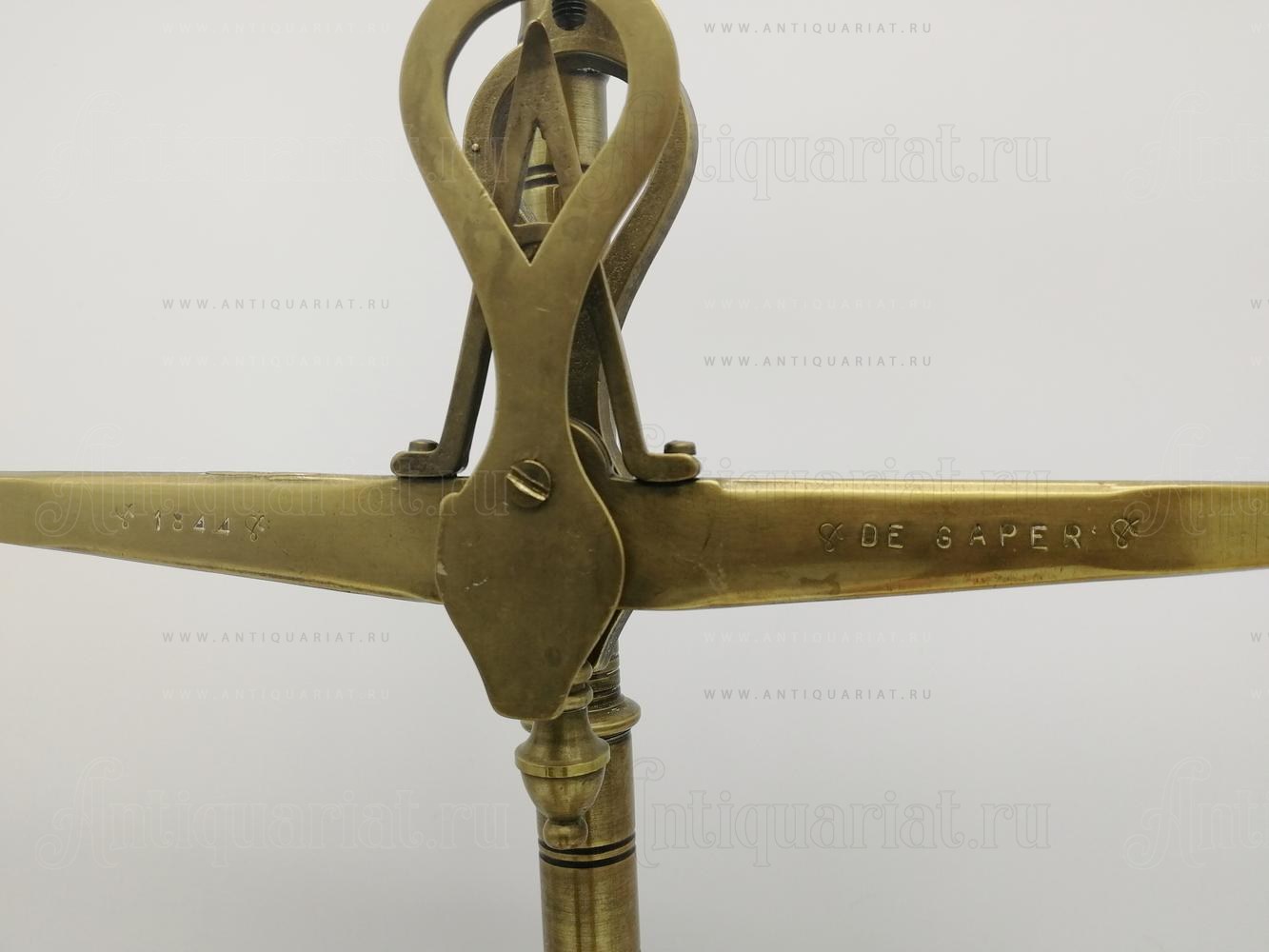 Изготовлены в Голландии фирмой "D.L.C. Pharmacy Scales with weights", 1844 году (см. обозначение на фото). Логотип/торговая марка D.L.C. выгравировано на дне. На передней части баланса выгравирован логотип французского автора модели - De Gaper *1844.