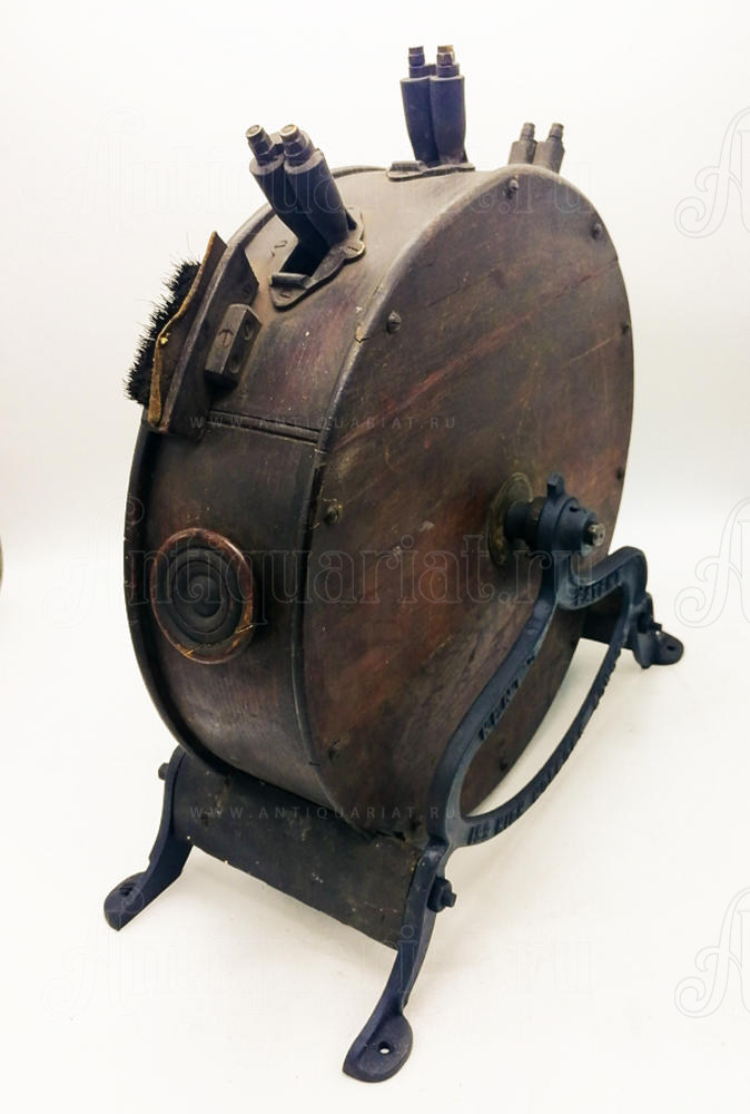 Аппарат для очистки ножей от загрязнений и последующей их мелкоабразивной полировкой и заточкой. Корпус изготовлен из древесины дуба, установлен на литые чугунные основания. Посредством вращения ручки внутри корпуса приводится в действие барабан который чистит и полирует кухонные ножи. В качестве чистящегося средства в корпус засыпался абразивный материал (порошок пемзы или т.п.).