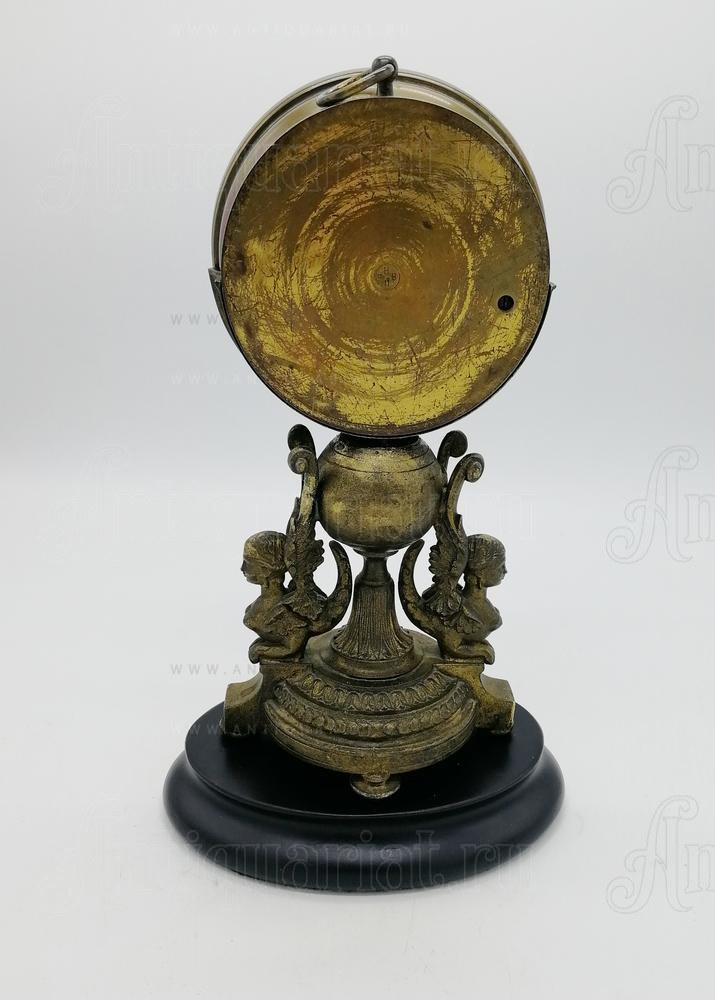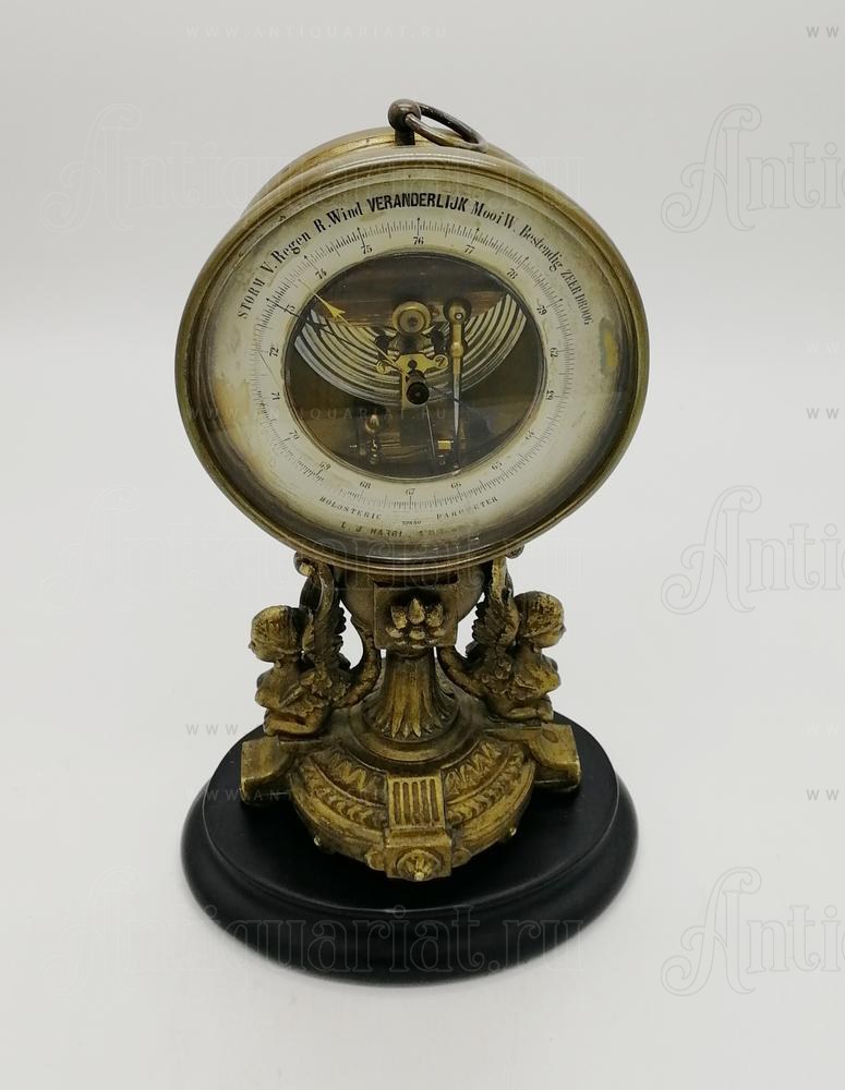 Классический анероидный барометр с латунным корпусом и стеклянной крышкой установлен на декоративная поставка в виде двух сфинксов. Прибор предназначенный для измерения атмосферного давления. На циферблате нанесены значения давления в миллиметрах ртутного столба (от 62 до 79 мм рт. ст.) и погодные обозначения на голландском языке: Storm (шторм), Regen (дождь), Veranderlijk (переменная погода), Mooi (хорошо), Zeer droog (очень сухо). Имеется двойная стрелка: чёрная — текущие показания давления, и подвижная золотистая — для фиксации предыдущих значений и наблюдения за изменениями.