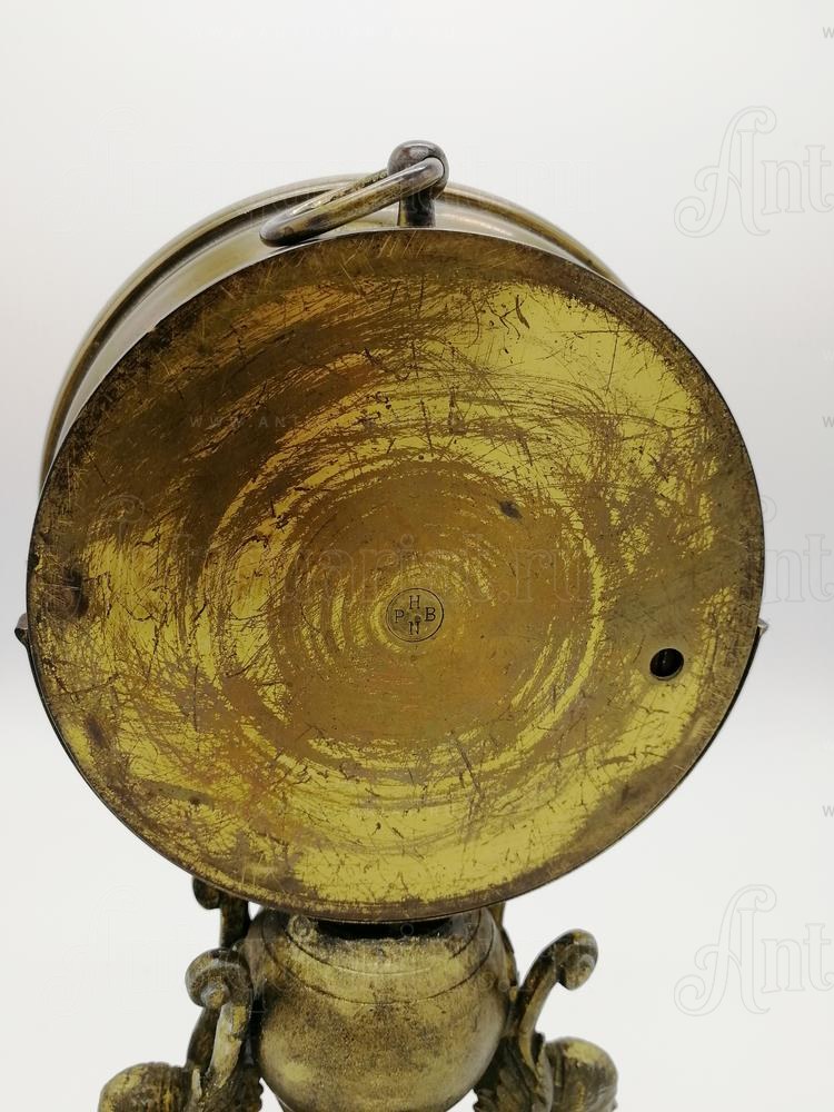 Внутренний механизм с сильфоном (гибкой металлической капсулой) демонстрирует типичную для анероидов конструкцию начала XX века. На обратной стороне корпуса — клеймо PHBN в круге, указывающее на производителя.