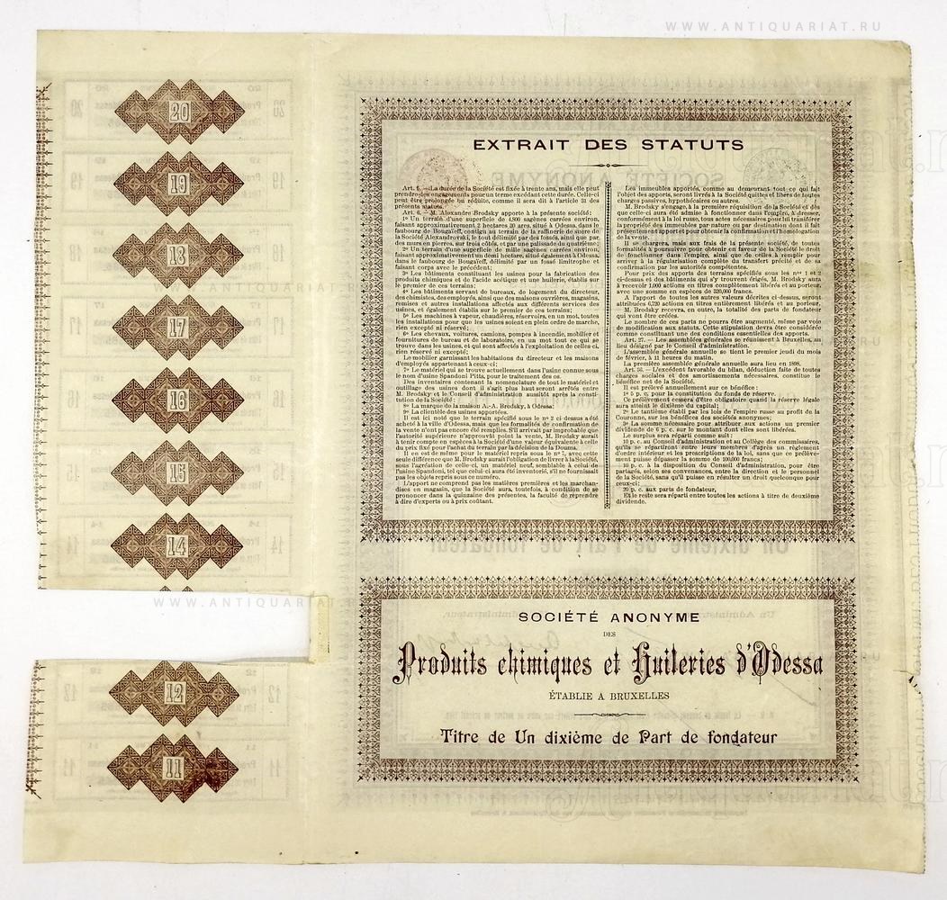 "Societe anonyme des Produits Chimiques et Huileries d'Odessa. Titre de Un Dixieme de Part de fondateur. Bruxelles, 1896"