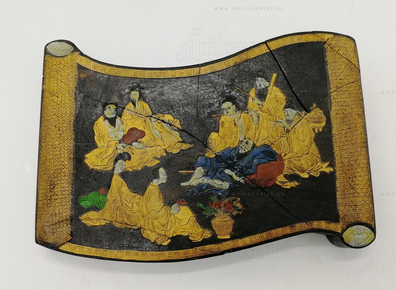 На лицевой стороне изображена сцена с учёными/мудрецами — типичный сюжет в китайской культуре: