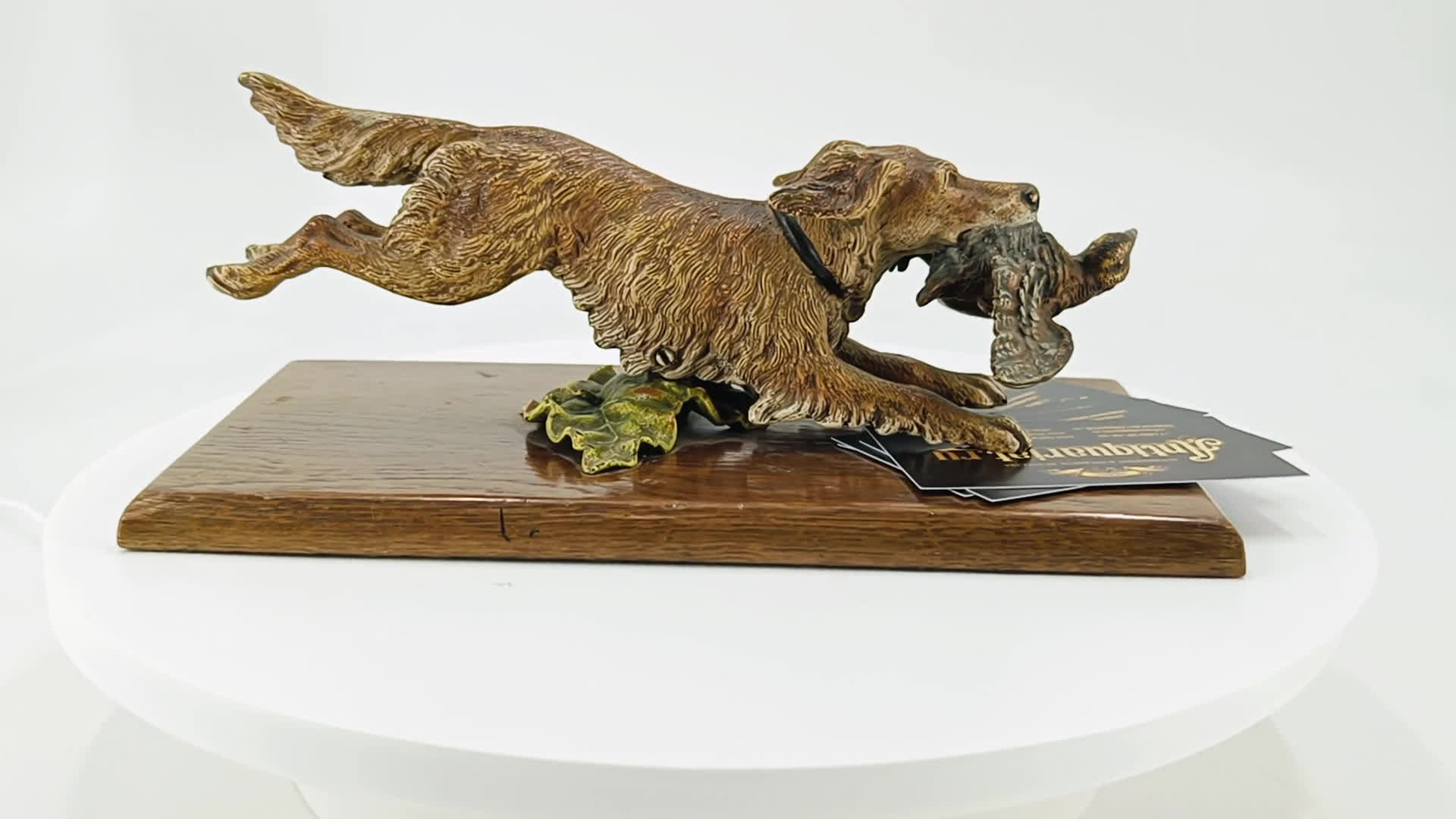 Основная фигура отлита из бронзы с применением техники многоцветного патинирования, характерной для венских мастерских конца XIX столетия. Собака изображена в динамичной позе с характерными анатомическими деталями породы, что указывает на высокий уровень наблюдательности скульптора и его знакомство с охотничьей тематикой. Добыча — птица с распростертыми крыльями — выполнена с тщательной проработкой оперения. Роспись красками имитирует естественную окраску шерсти животного и перьев птицы, создавая впечатление живой охотничьей сцены. Небольшие элементы растительности у основания фигуры дополняют композицию, придавая ей завершенность.