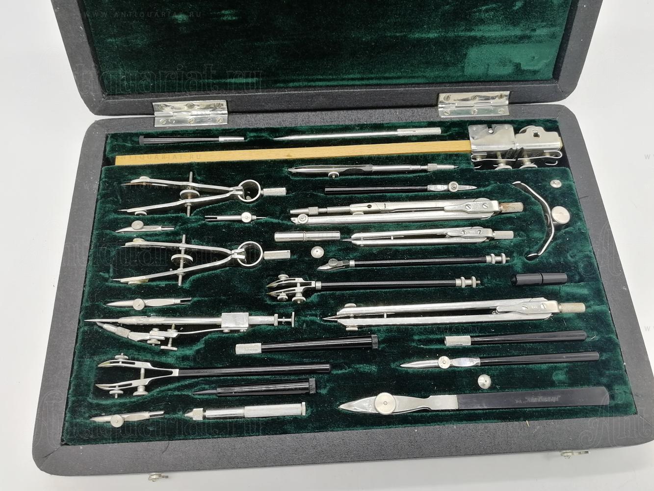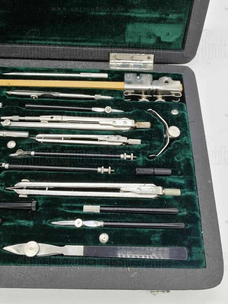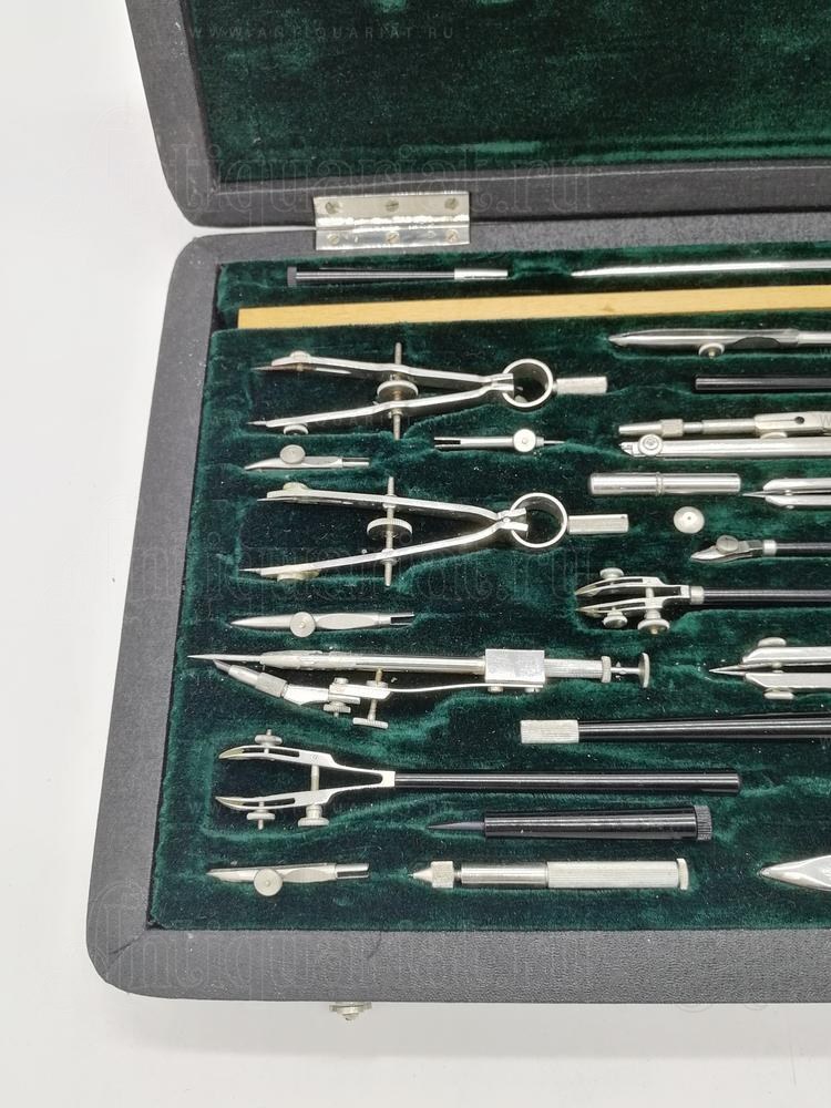 В наборе имеются: циркуль большой, циркуль малый, измеритель большой, измеритель малый, крон циркуль, крон измеритель, циркуль балеринка, три рейсфедера (разной величины) для прямых линий, два рейсфедера для параллельных линий, чертежный штангенциркуль для окружностей радиусом до 550 мм., а таже комплект оснастки и съемных насадок. (см. фото).