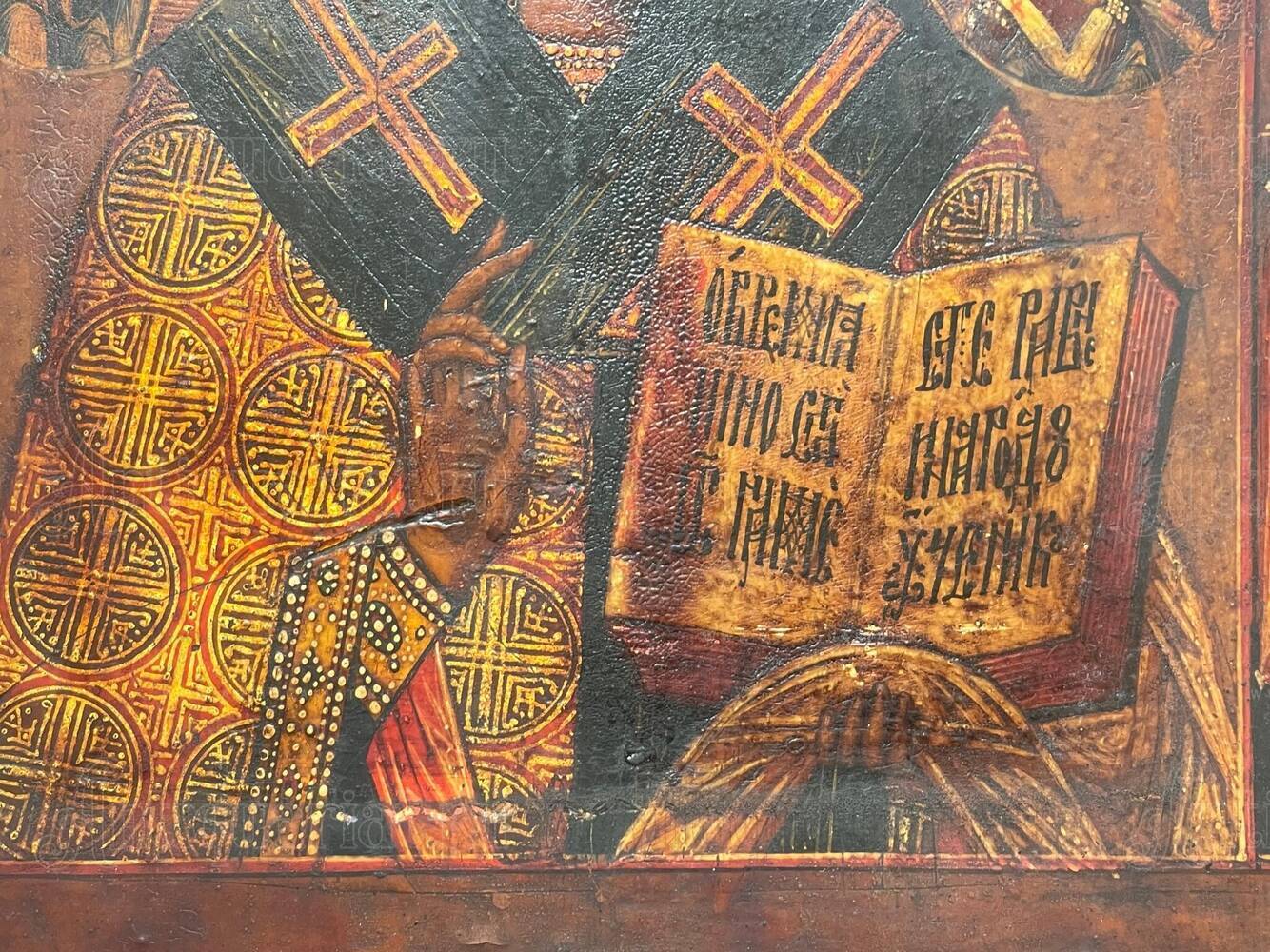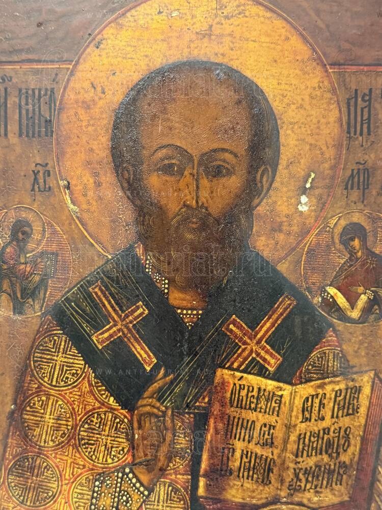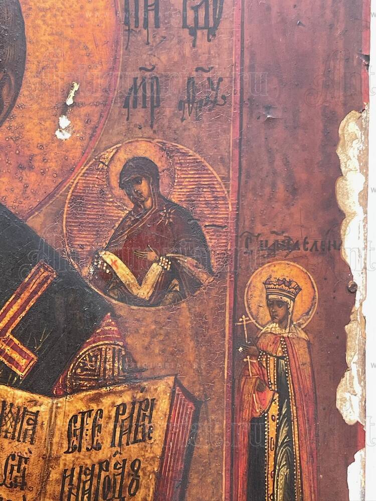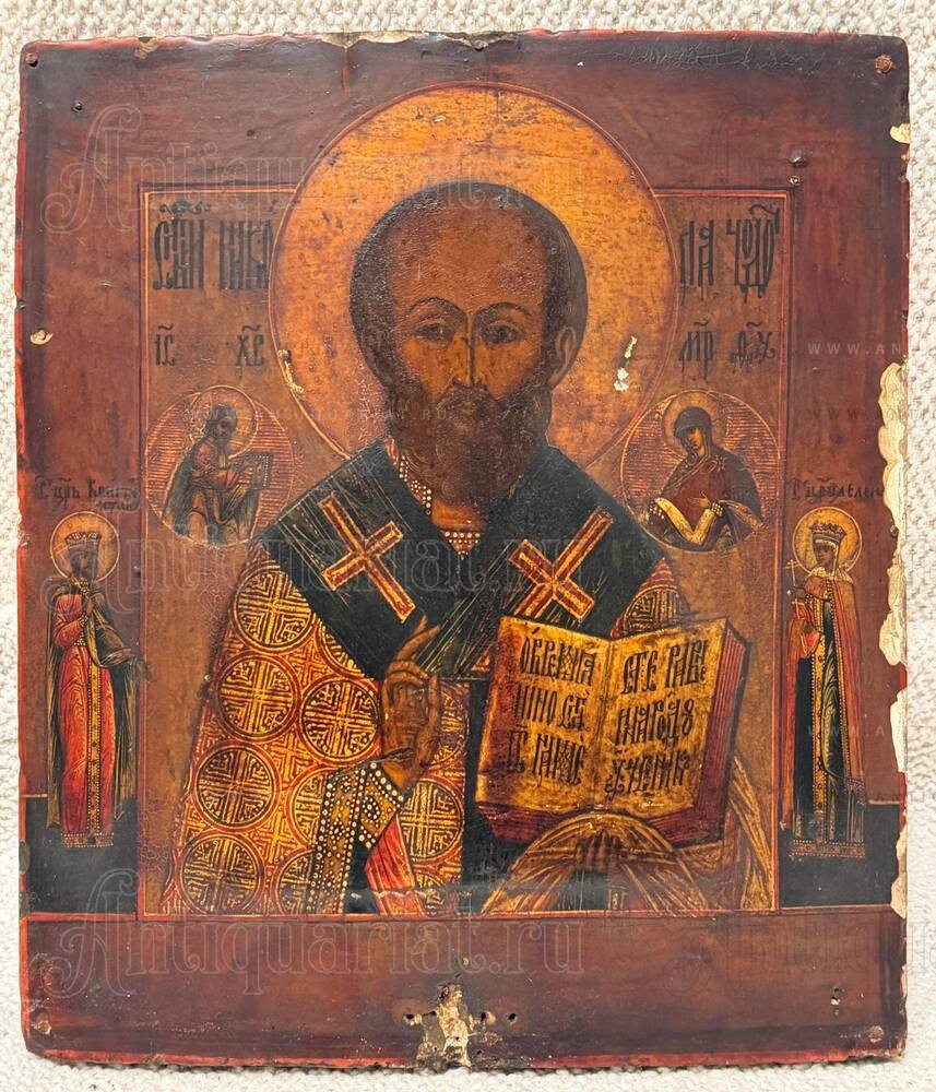 Владимирские иконописные сёла — Палех, Мстёра и Холуй — составляли в девятнадцатом веке один из важнейших центров производства православных икон в Российской империи. Эти мастерские обеспечивали потребности не только местных приходов, но и поставляли иконы по всей России, от крестьянских домов до купеческих особняков. Иконописцы владимирских сёл прошли многовековую школу мастерства, восходящую к традициям древнерусской живописи, сохраняя при этом характерные технические приёмы и иконографические изводы. Особенностью владимирской школы являлось сочетание строгой каноничности композиций с тонкостью письма и богатством декоративного оформления. Святитель Николай почитался на Руси как один из наиболее чтимых святых, покровитель путешественников, моряков, торговцев и земледельцев, поэтому иконы с его изображением присутствовали практически в каждом православном доме. Предстоящие Константин и Елена, обретшие Животворящий Крест Господень, добавляли иконе дополнительную символику защиты и покровительства. Подобные трёхфигурные композиции пользовались популярностью в провинциальном благочестии как семейные моленные образы. На современном антикварном рынке владимирские иконы девятнадцатого века представляют устойчивый интерес коллекционеров благодаря высокому техническому уровню исполнения и исторической значимости этой иконописной традиции. Нереставрированные экземпляры под родной олифой ценятся особенно высоко, поскольку демонстрируют подлинную технологию и материалы эпохи без позднейших наслоений.