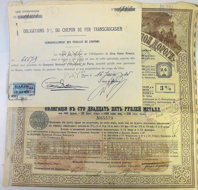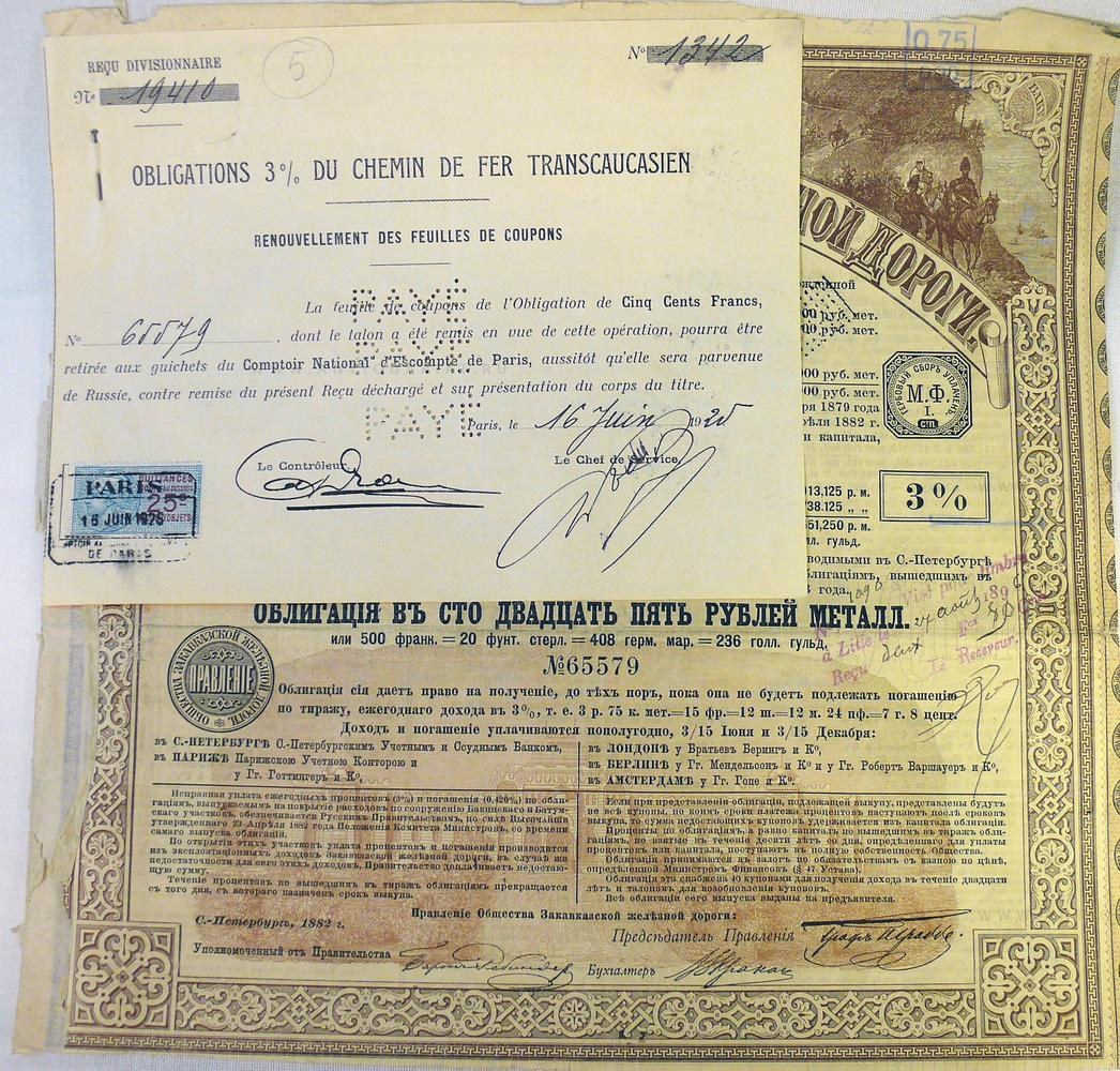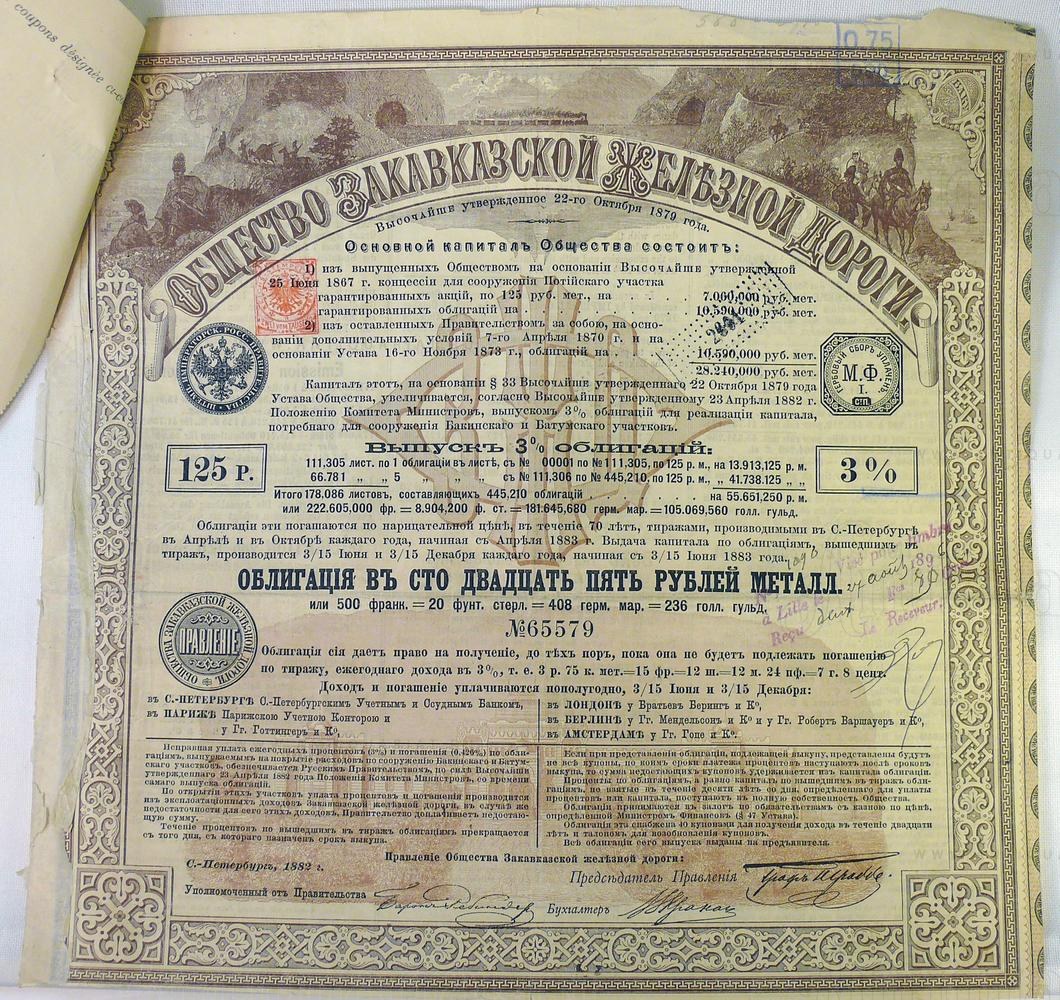 3% облигация Общества Закавказской железной дороги, выпущенная в 1882 году согласно Высочайше утвержденному положению Комитета Министров для увеличения капитала Общества, что требовалось для сооружения Батумского и Бакинского участков.