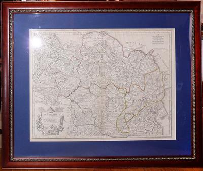 Старинная гравированная карта. Границы раскрашены вручную акварелью, орнаментированный картуш работы N. Guerard.