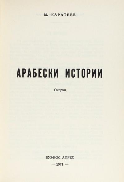 [Об исламе в России из Аргентины] Каратаев, В. Арабески истории. Очерки. Буэнос-Айрес: Издание автора, 1971. 222 с. В издательской иллюстрированной обложке. В отличном состоянии.