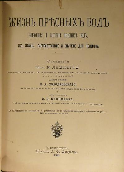Перевод с немецкого, с дополнениями и применительно к русской фауне и флоре, под редакцией доктора зоологии Н. А. Холодковского, профессора Императорской Военно-Медицинской Академии, и канд. ест. наук И. Д. Кузнецова, действительного члена Императорского Российского Общества Рыбоводства и Рыболовства.