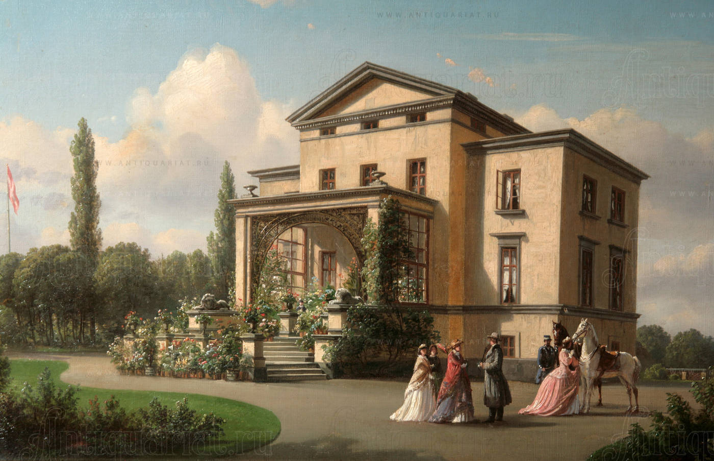 Старинная картина Летний пейзаж с виллой и лошадьми в старинной деревянной раме. Западная Европа (предположительно - Дания). Состояние сохранности очень хорошее. Картина не реставрировалась. Размер с рамой: 88 х 112 см.