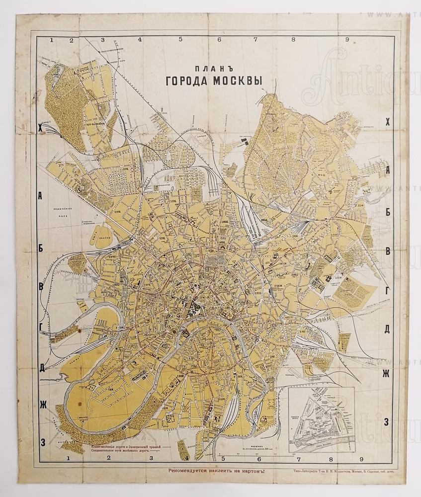 Россия. 1910-1915 гг. Типо-Литография Т-ва И.М. Машистова. 560 х 485 см. Отдельная карта - План Кремля. 300 саж. в дюйме. Размер изображения 510 х 640 мм.