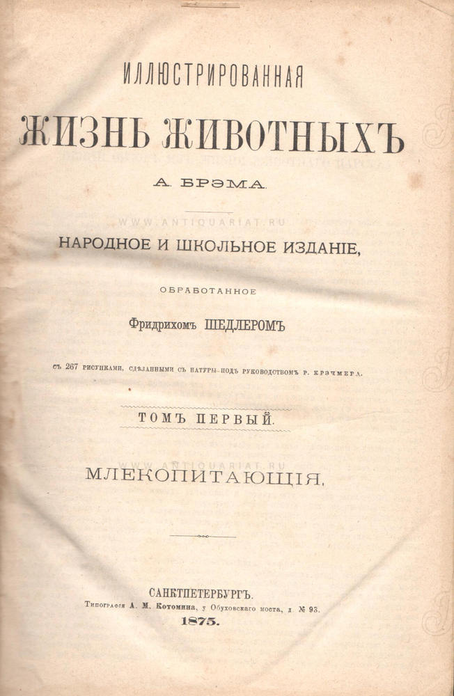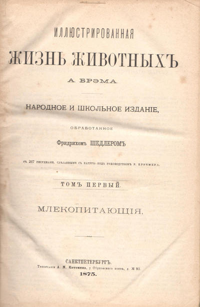 Том I. Млекопитающие. 1875 г. Типография А.М. Котомина. 322 стр., XVI стр. с 267 рисунками.