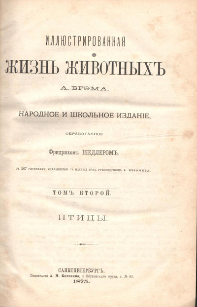 Том II. Птицы. 1875 г. Типография А.М. Котомина. 285 стр., XIV стр.с 267 рисунками.