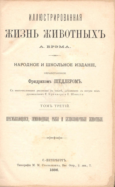 Том III. Пресмыкающиеся, земноводные и рыбы. 1886 г. Типография М.М. Стасюлевича. 498 стр., XXXIII стр. с многочисленными иллюстрациями в тексте.