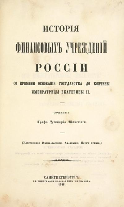 Толстой, Д., граф. История финансовых учреждений России со времени основания государства до кончины Императрицы Екатерины II.
