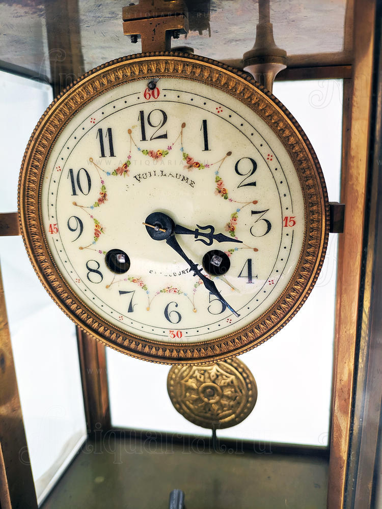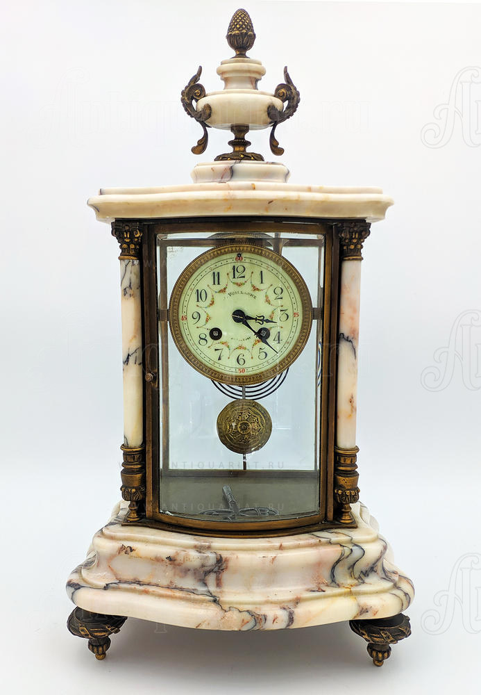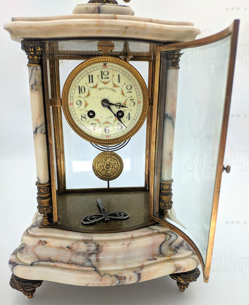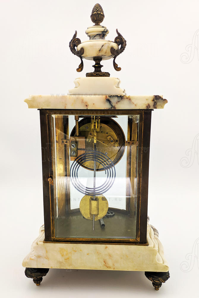 Часы с раздельным ключевым заводом, имеют часовой и получасовой бой. Декор выполнен в стиле ампир из мрамора и литой бронзы с прочеканкой и золочением.