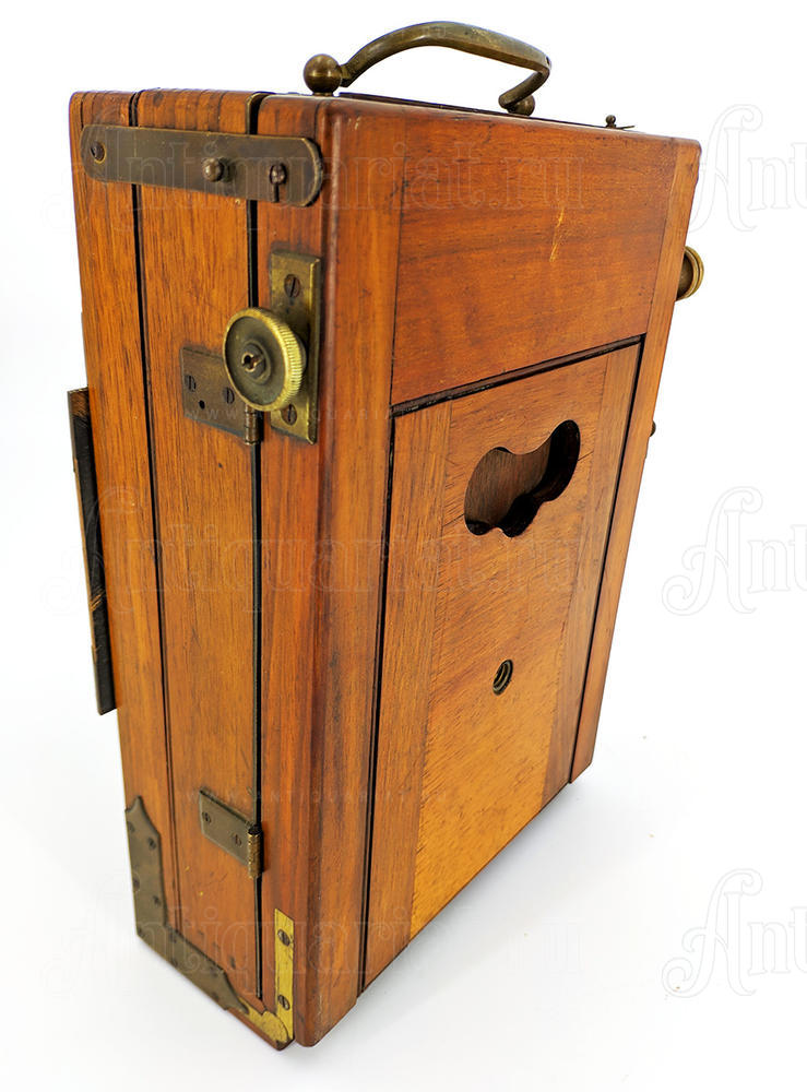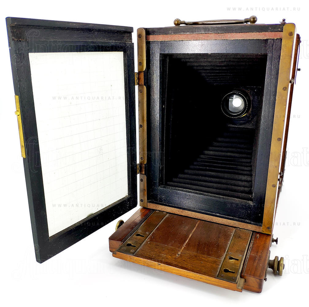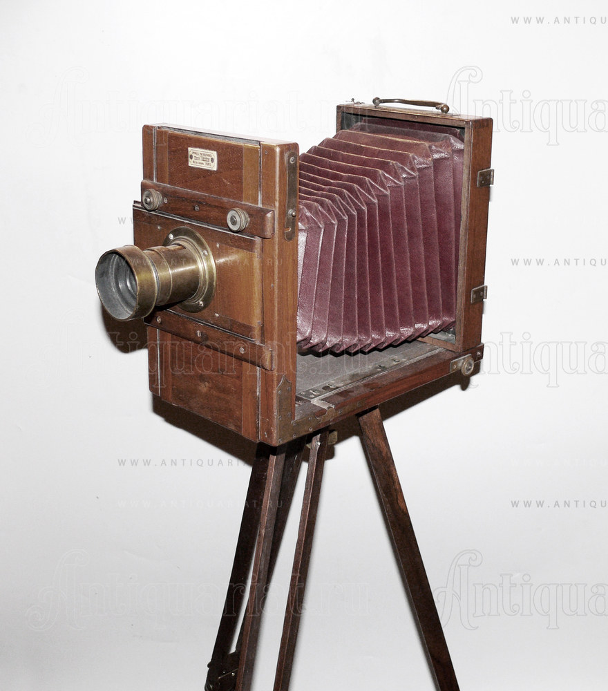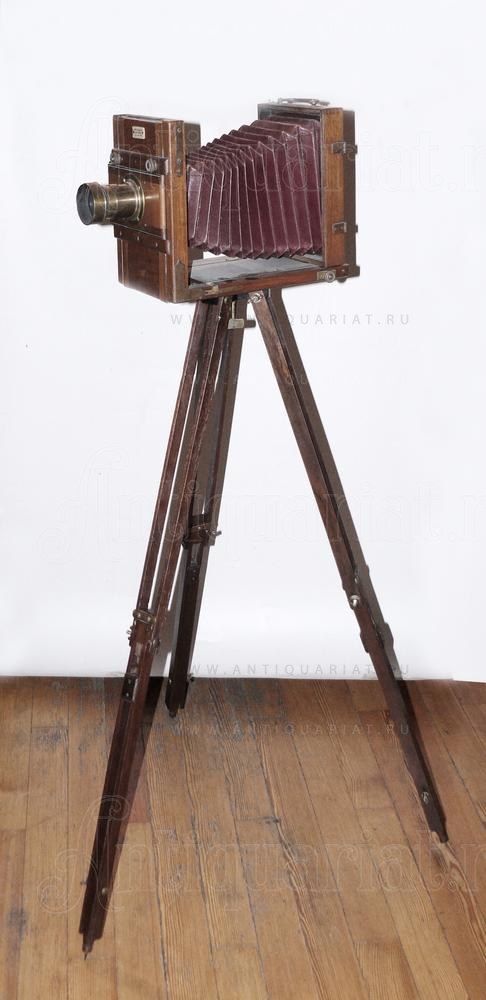 Одна из ранних студийных фотокамер. На объективе ещё отсутствует механический затвор с выдержкой съемки