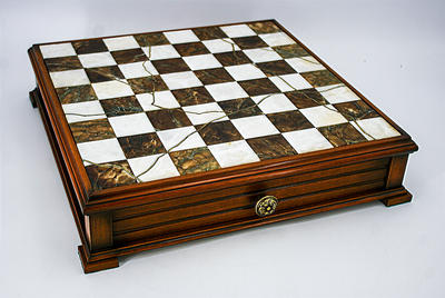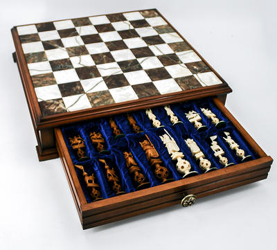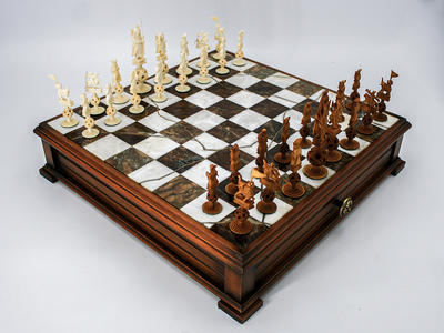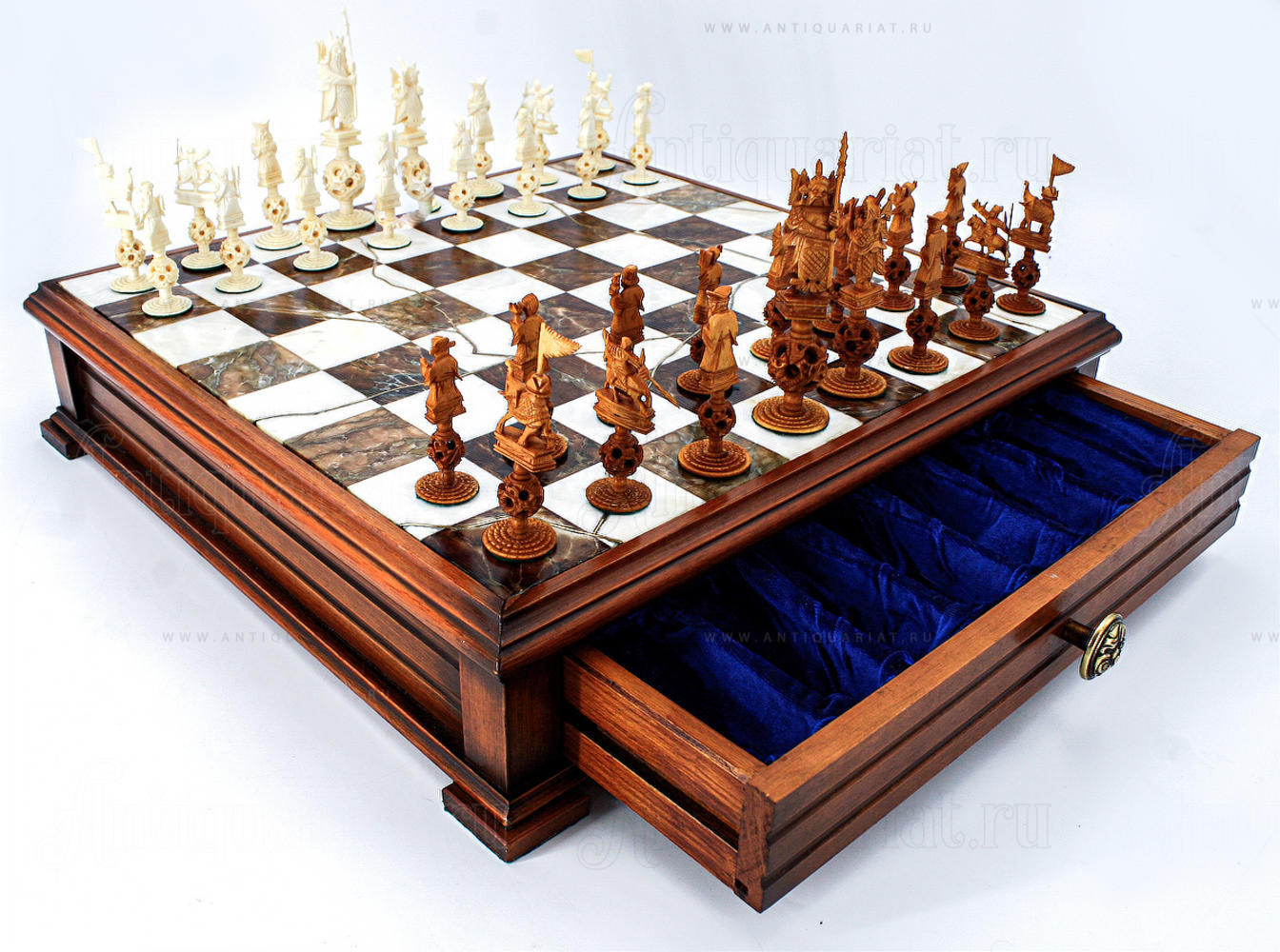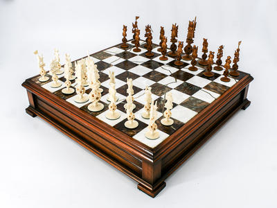 Набор состоит из комплекта шахмат и игровой доски с выдвижным ящиком. Фигуры в наборе изготовлены ручным способом (резьба) из кости и представлены в виде китайских средневековых воинов. Устои каждой фигуры декорированы многослойным резным шаром. Шахматы изготовлены в Китае в середине ХХ века. В комплектацию набора входит шахматная доска с игровым полем набранным из двух видов оникса и инкрустированной бронзовыми вставками в стиле "Кинцуги". Основание с выдвижным ящиком изготовлено на заказ из красного дерева.