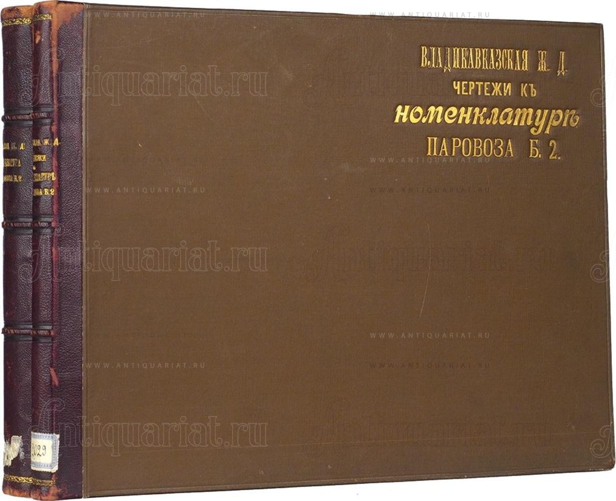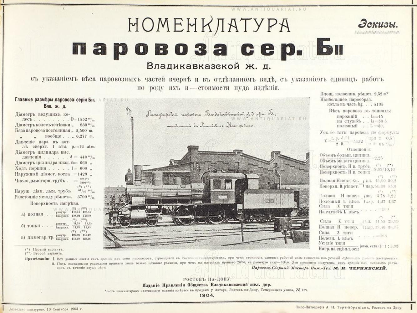 1. Номенклатура паровоза сер. БII Владикавказской железной дороги / с указанием веса паровозных частей вчерне и в отделанном виде, с указанием единиц работ по роду их и стоимости пуда изделия. Ростов-на-Дону: Изд. Правления общества Владикавказской железной дороги; Электропечатня А.И. Тер-Абрамиан, 1904. II, 456 с., табл.