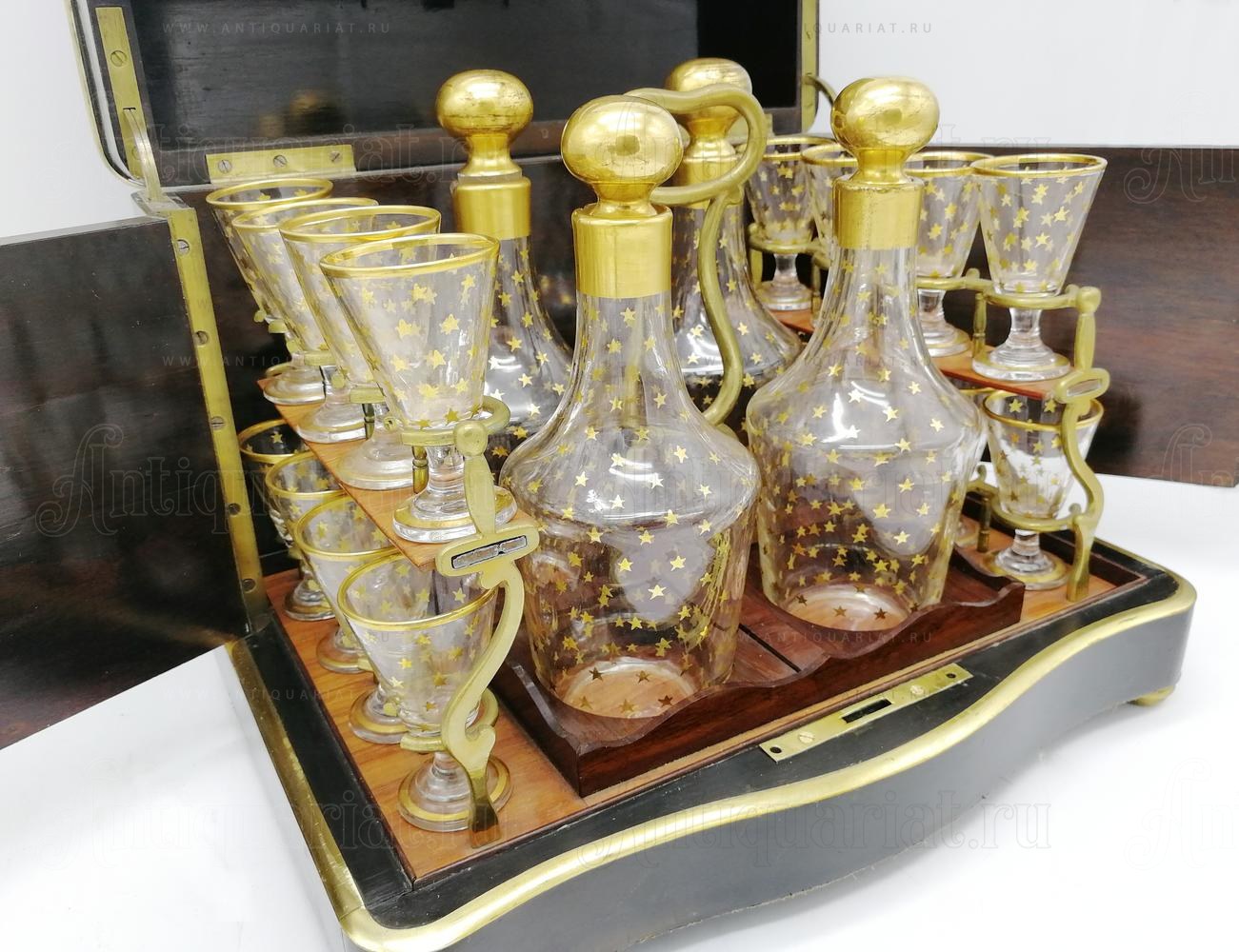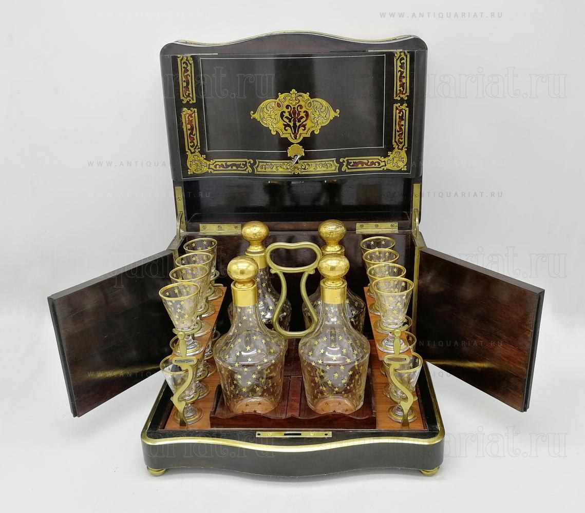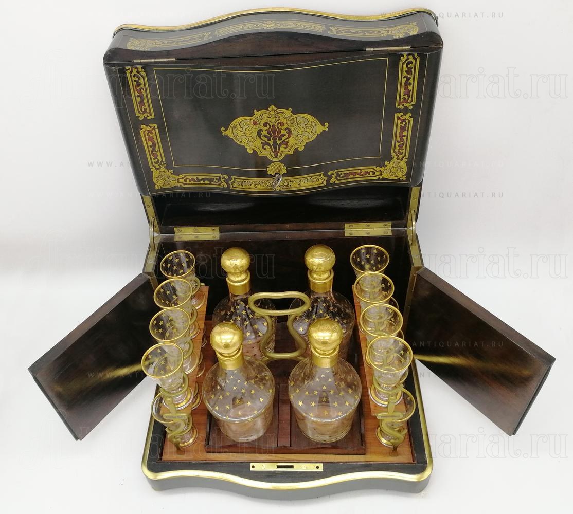 Коробка типа "арбалет" выполнена в стиле "буль" из ценных пород дерева, инкрустирована бронзовыми вставками, панцирем черепахи и перламутром. Штофы и рюмки для напитков расписаны вручную золотом.