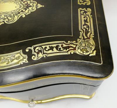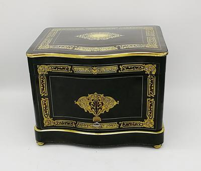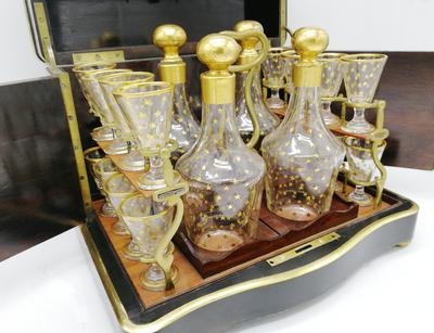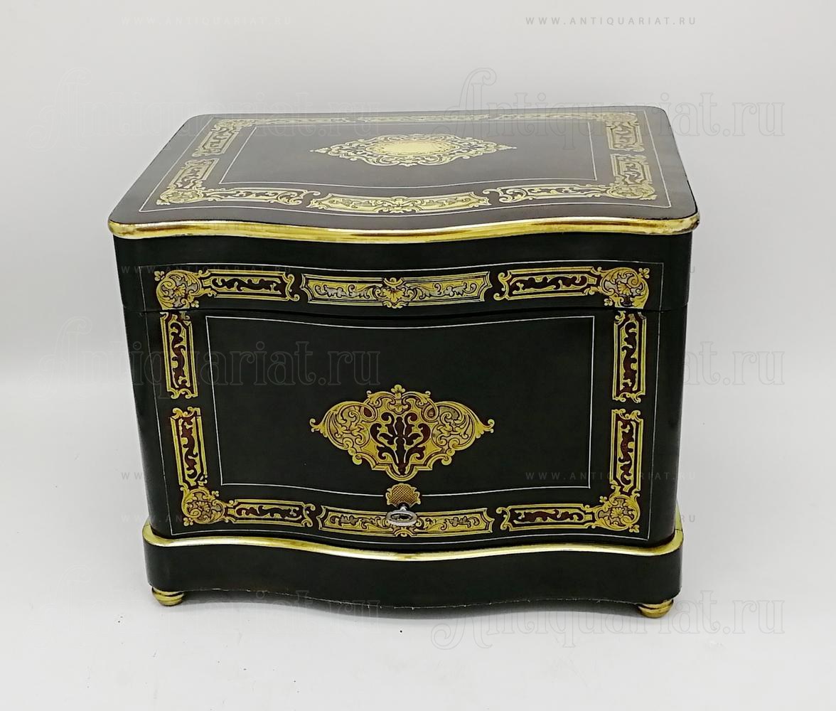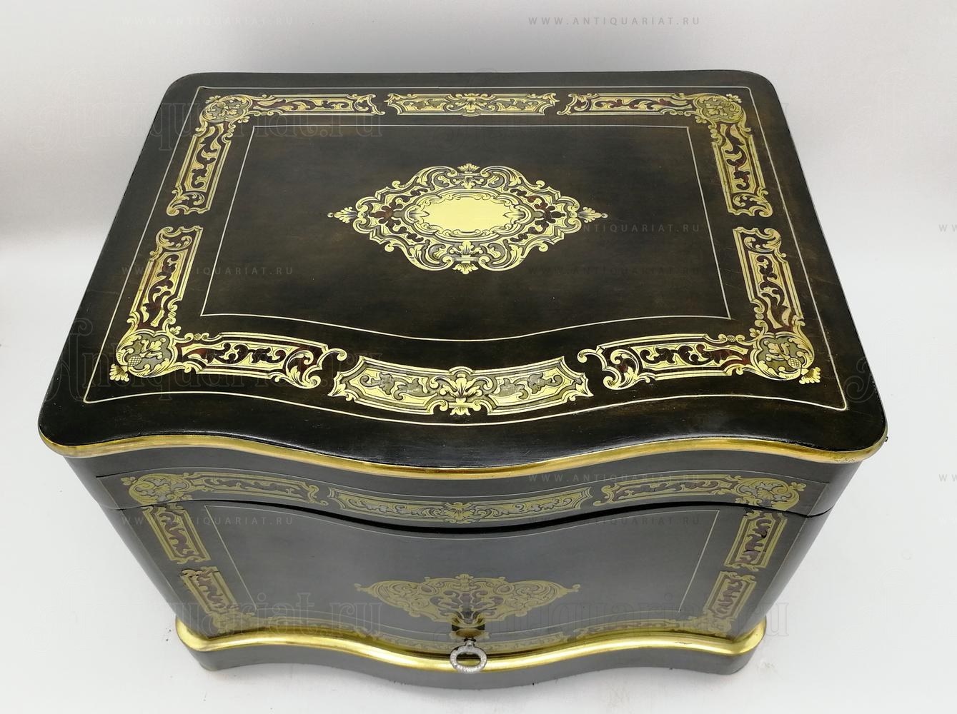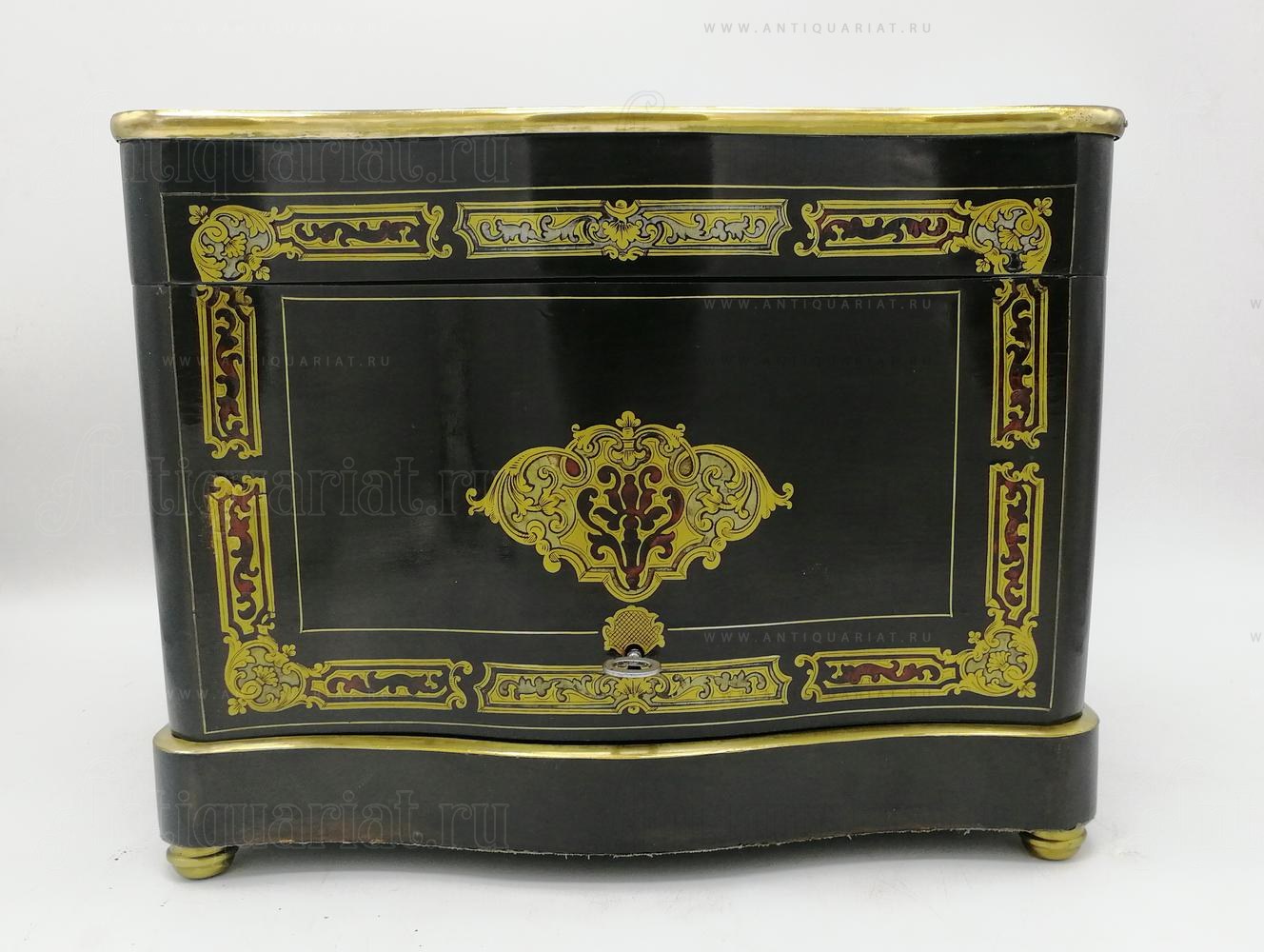 Коробка типа "арбалет" выполнена в стиле "буль" из ценных пород дерева, инкрустирована бронзовыми вставками, панцирем черепахи и перламутром. Штофы и рюмки для напитков расписаны вручную золотом.