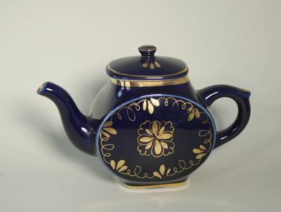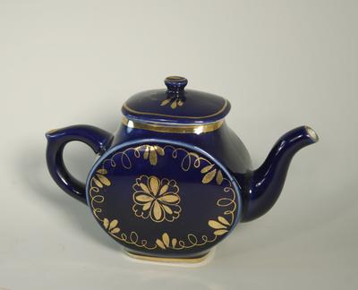 Чайник родом из Гжели - с нарядной золотой росписью по темно-синему кобальтовому фону.