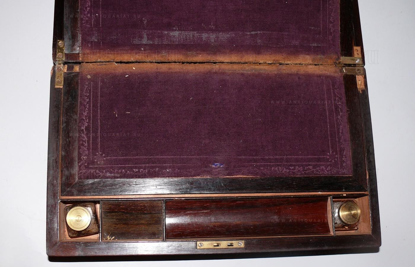Раскладное бюро, с подставкой для перьев, двумя чернильницами, отделениями для перьев и бумаг.