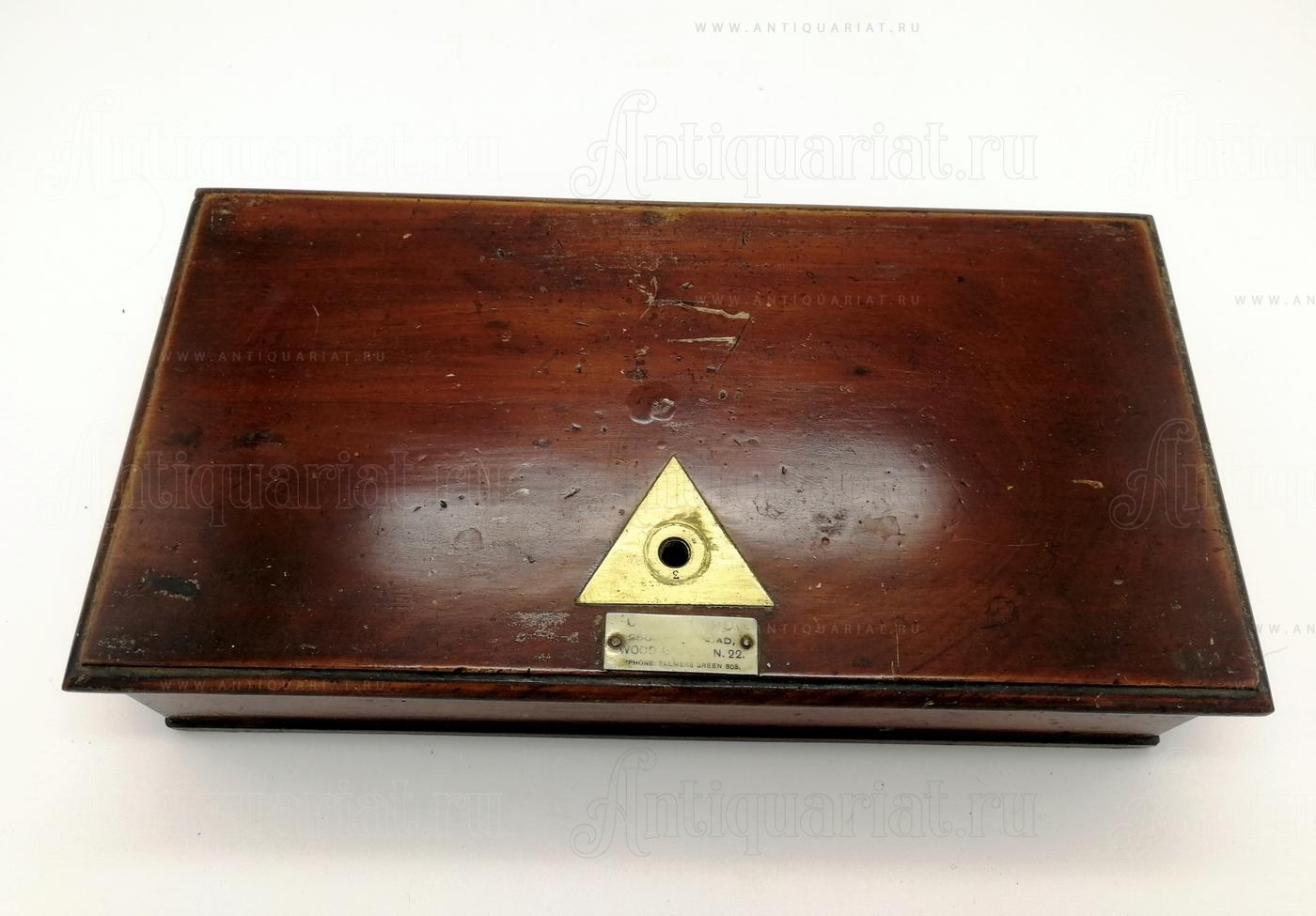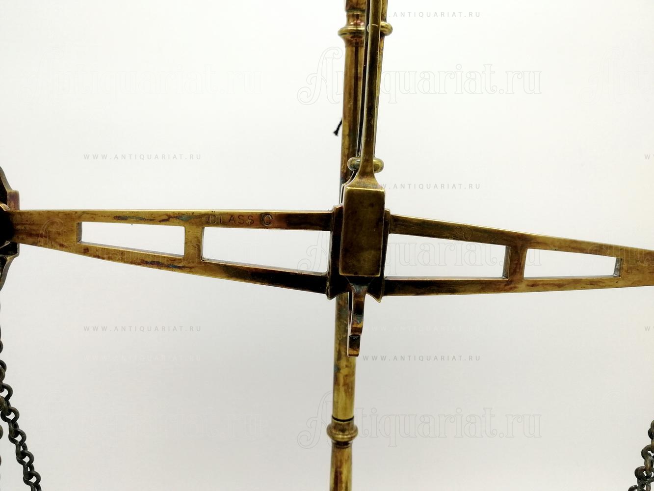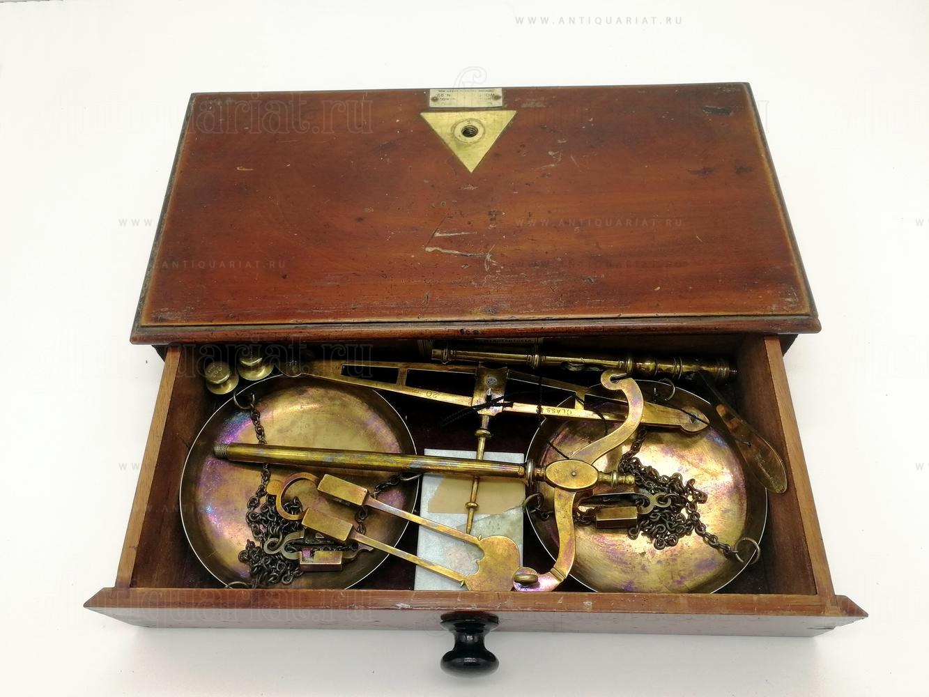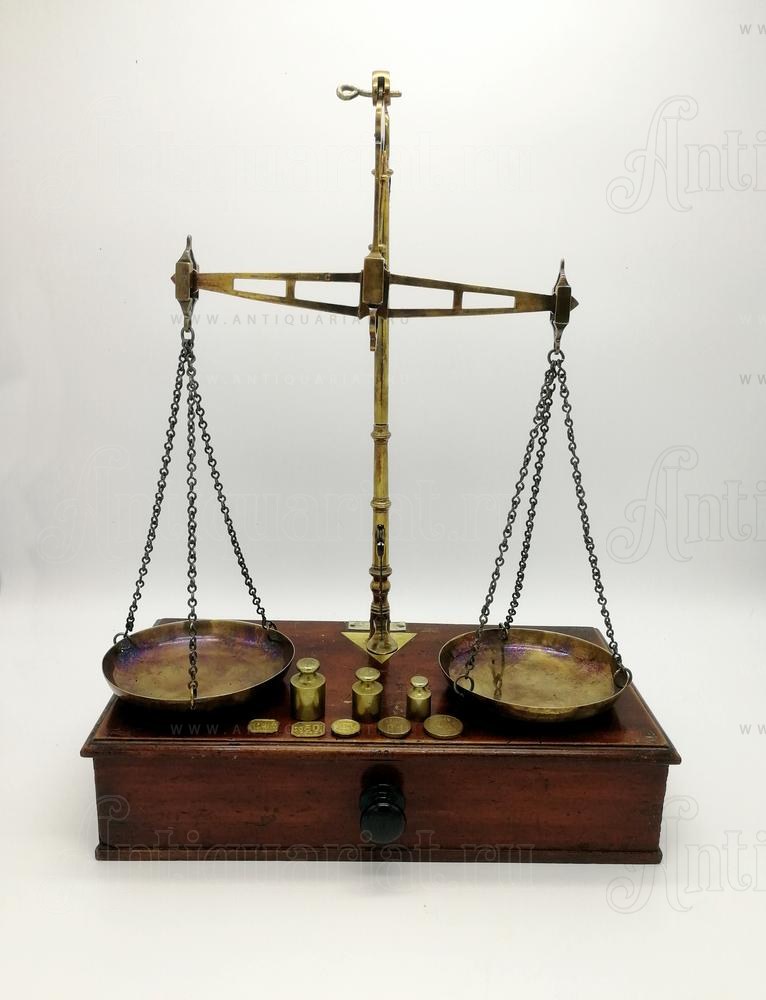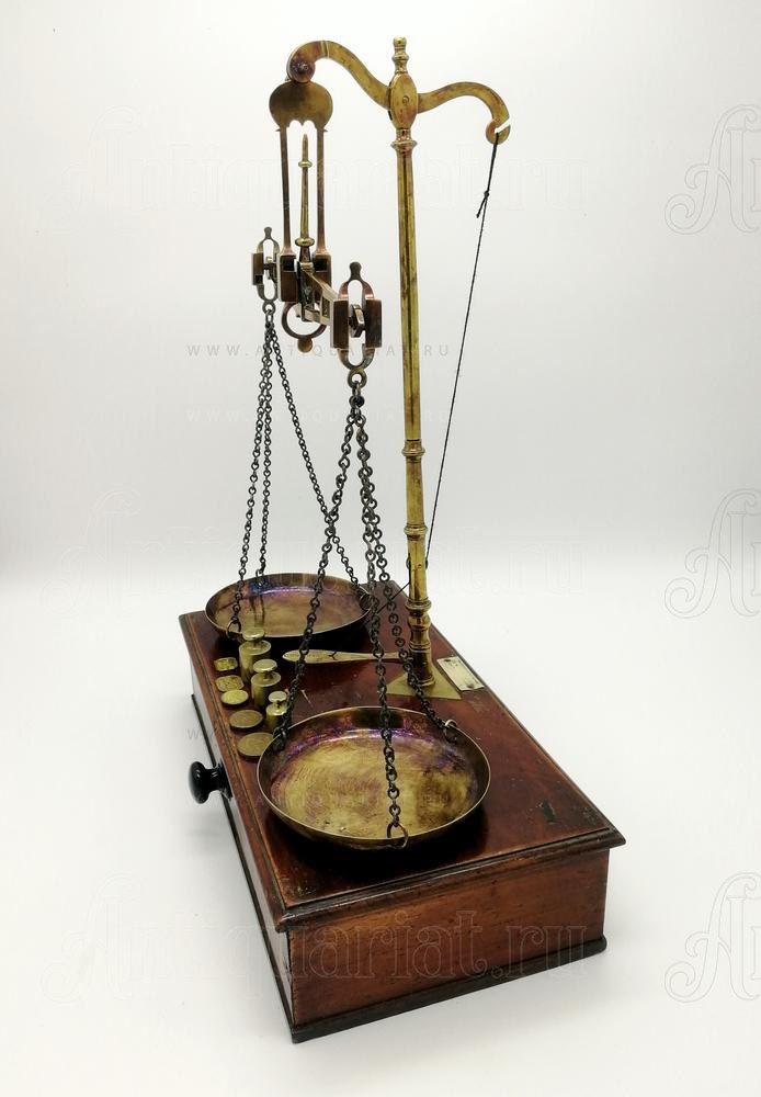В комплект входит набор из 8 бронзовых разновесов. Футляр из красного дерева, на который крепятся равноплечные рычажные весы. Для удобства транспортировки и хранения весы разбираются и складываются в выдвижной ящик.