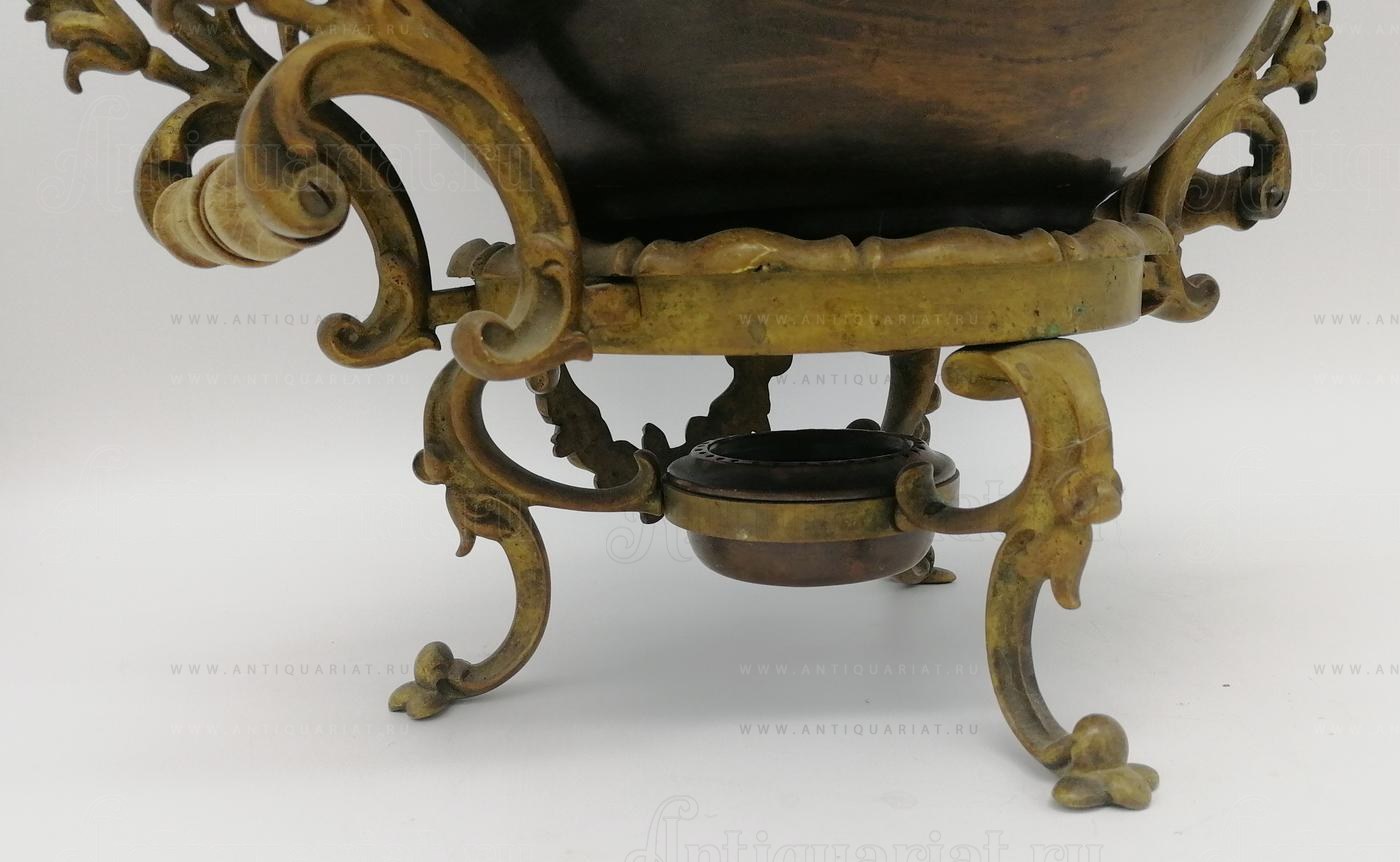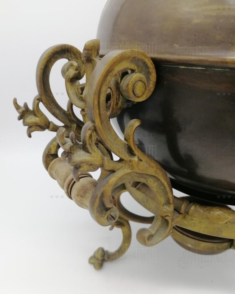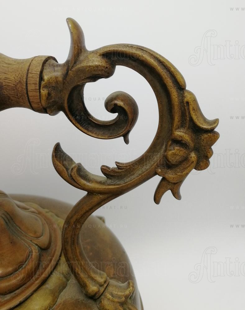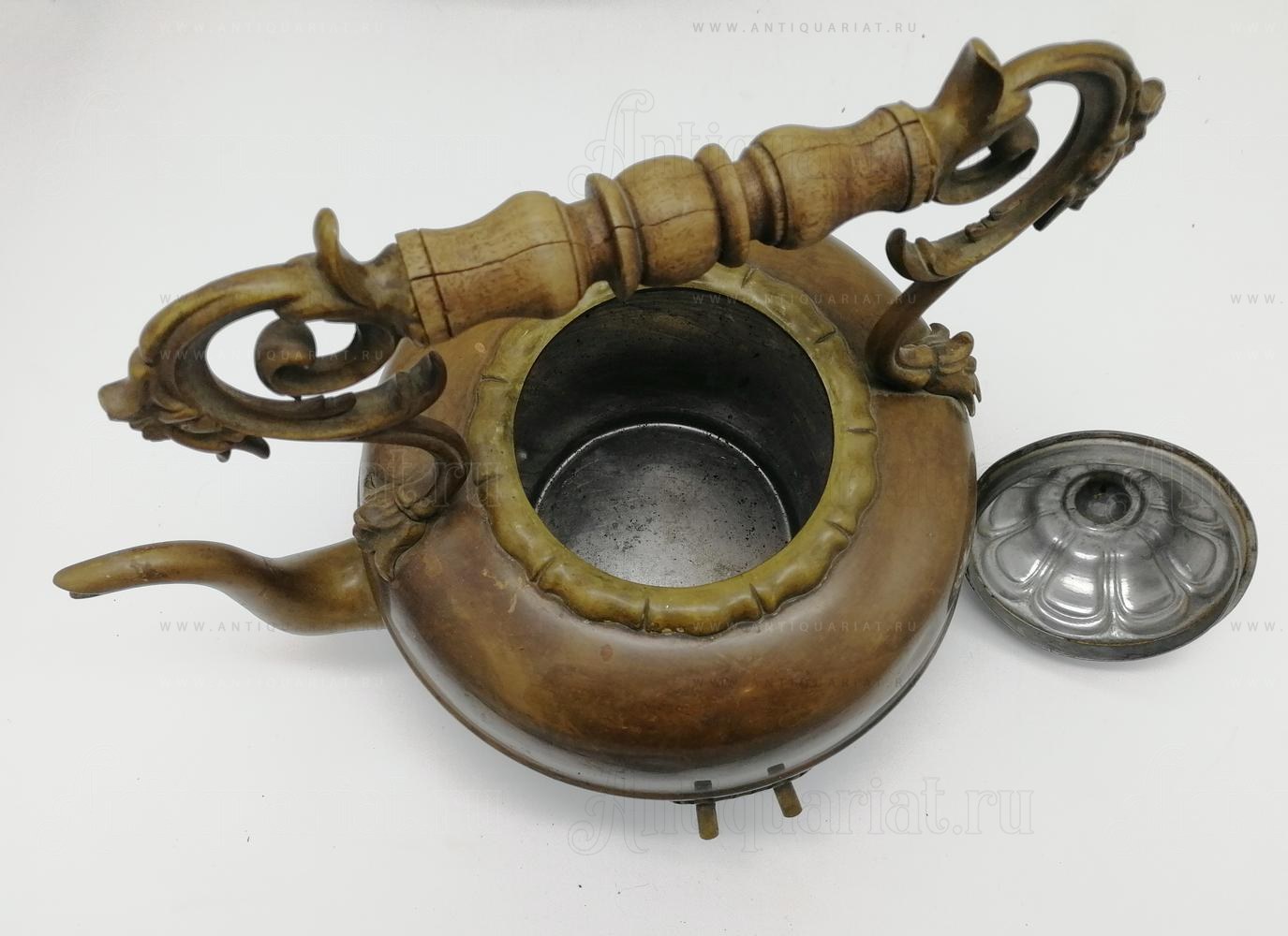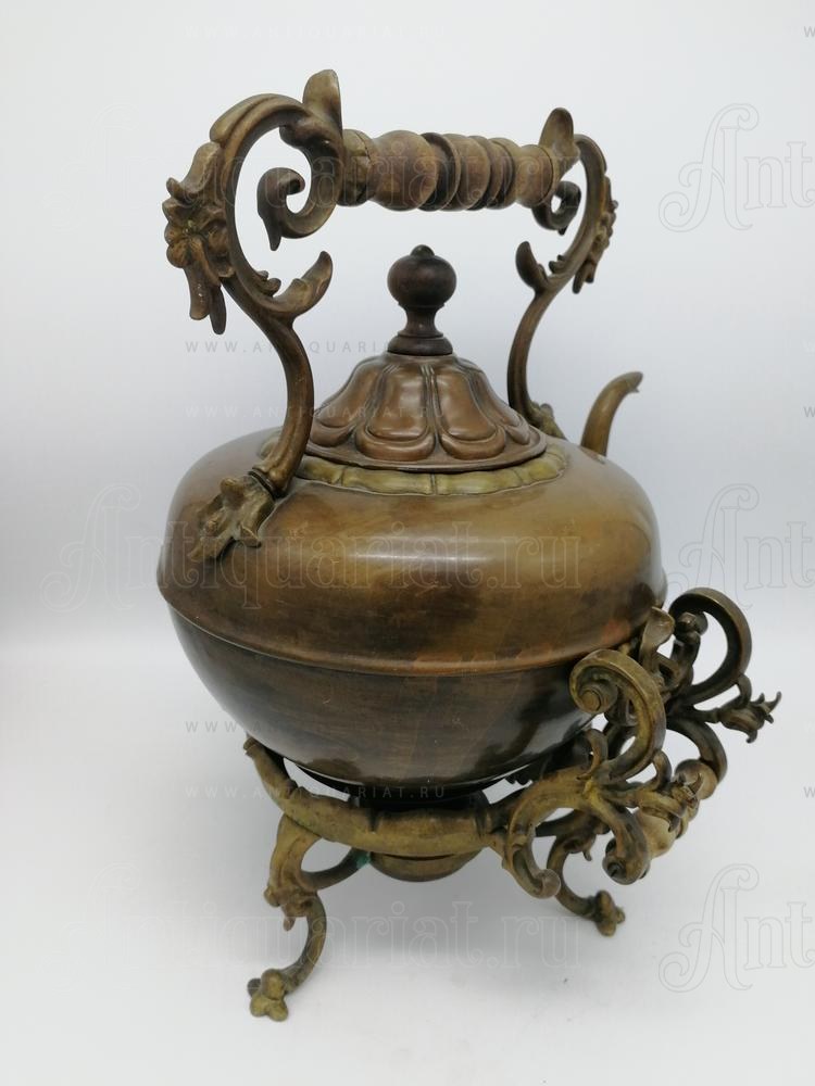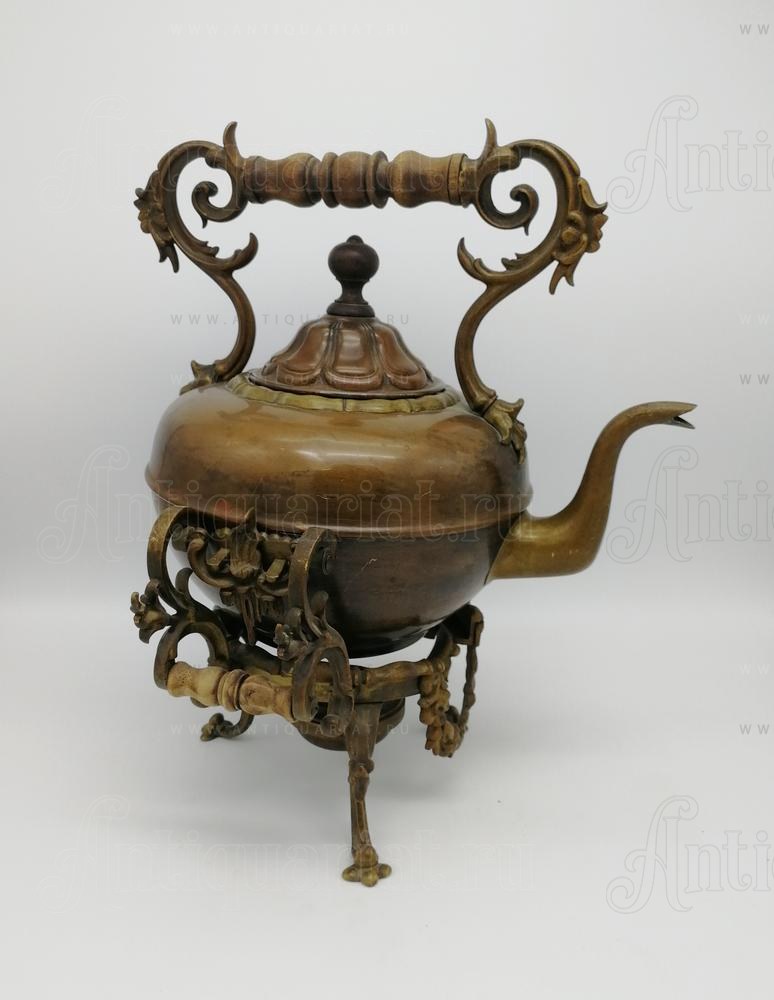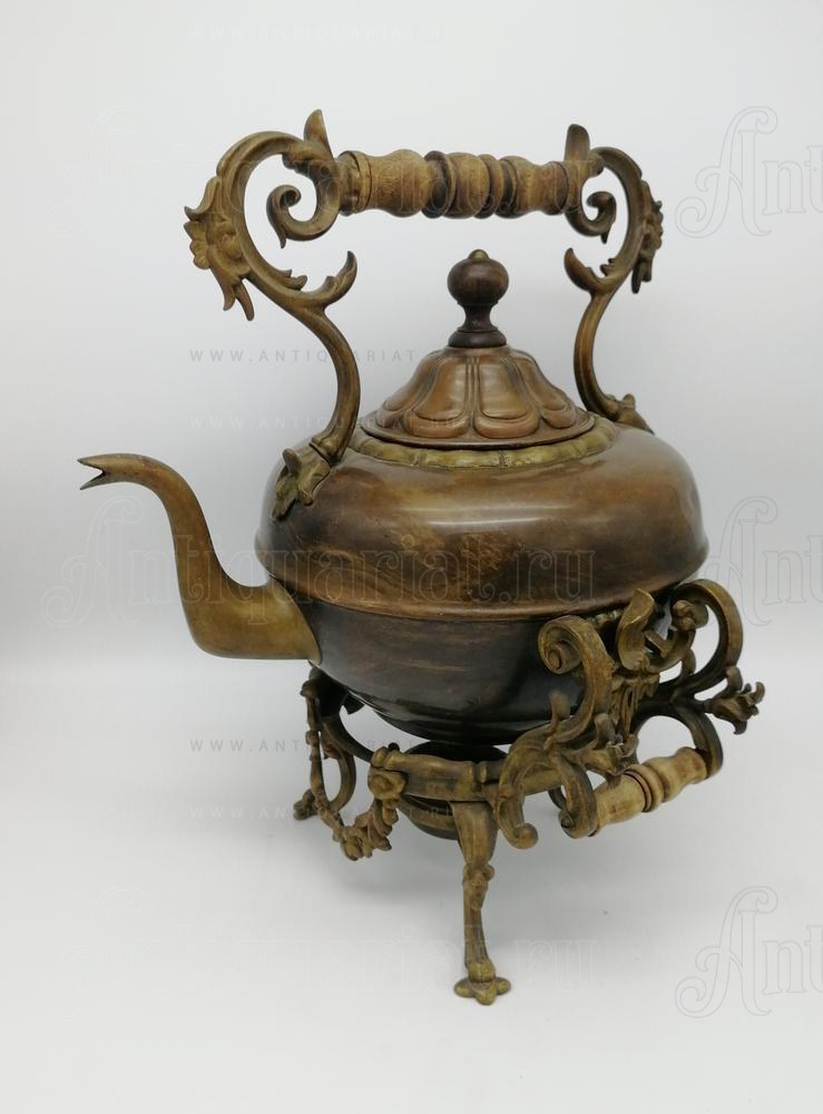 В комплект входит чайник , подставка и спиртовка. Изготовлен из бронзового сплава. Поверхность покрыта патиной. Внутренняя поверхность чайника лужёная. Хватки выполнены из древесины.