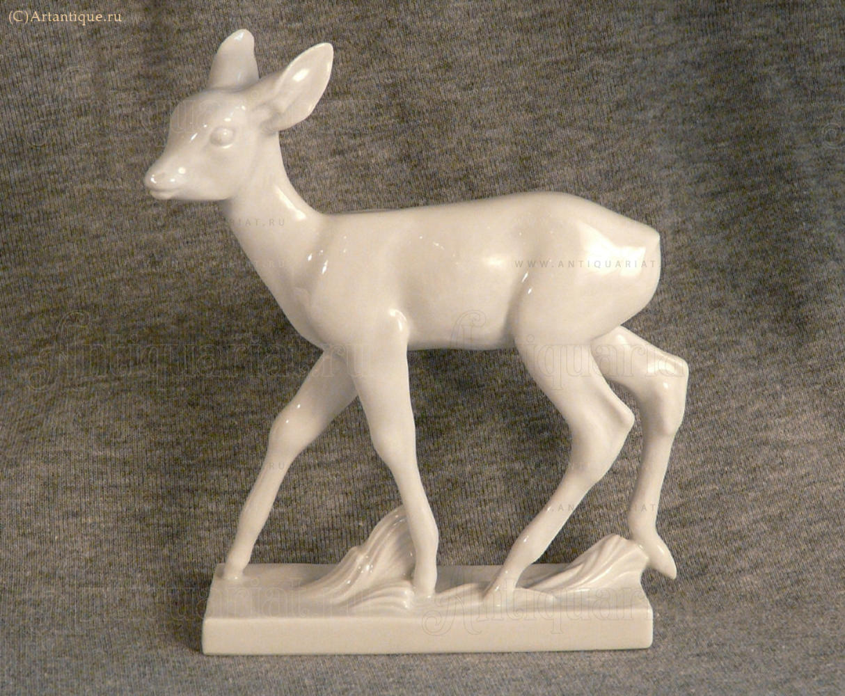 Небольшая фарфоровая статуэтка в виде идущего оленёнка.