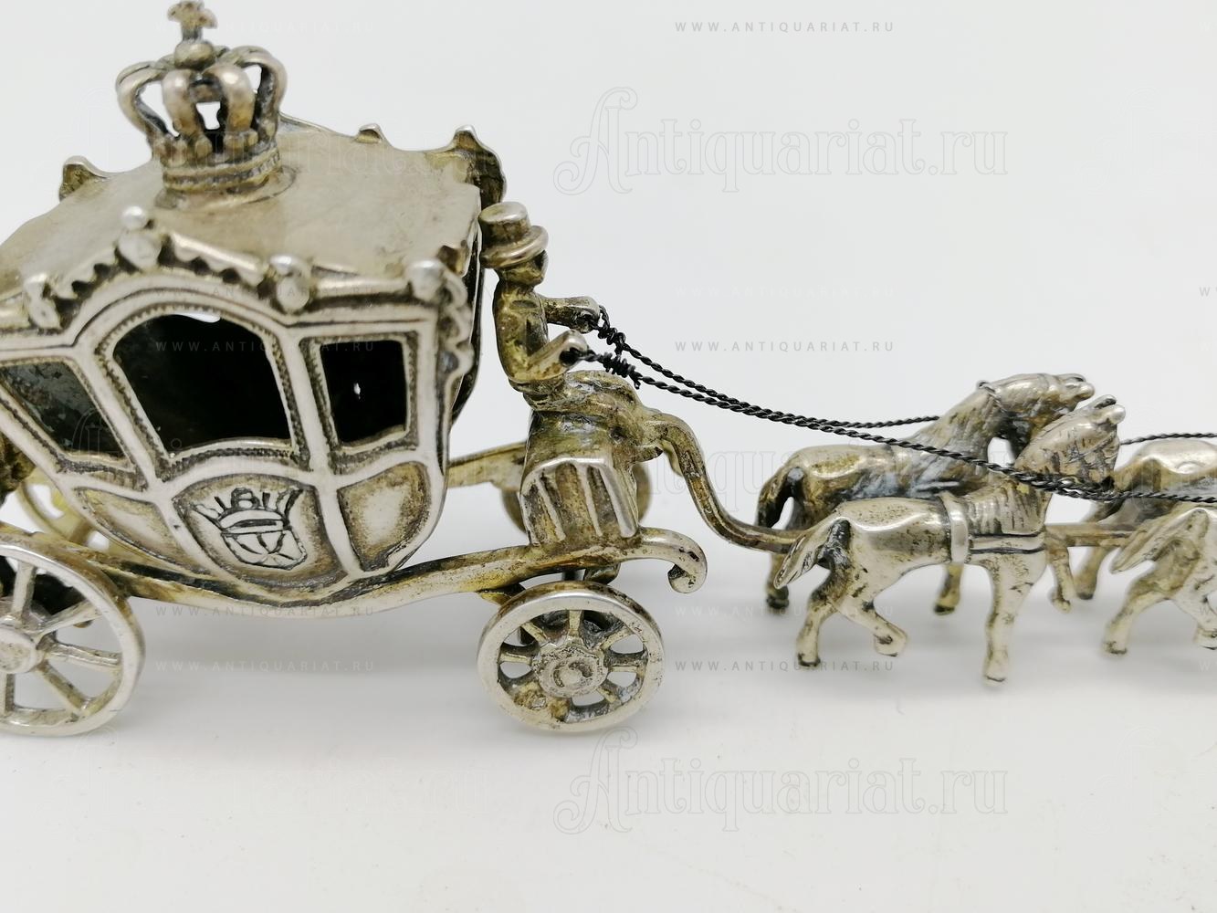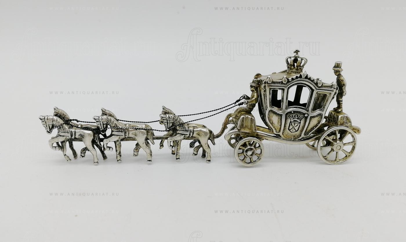 Миниатюра выполнена из серебра и изображает королевскую карету запряжённую шестёркой лошадей