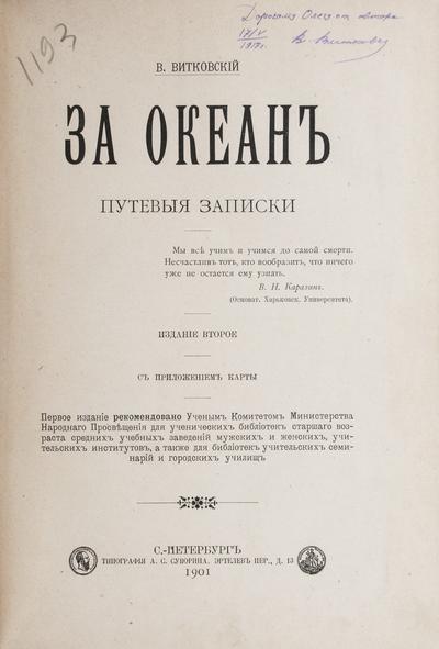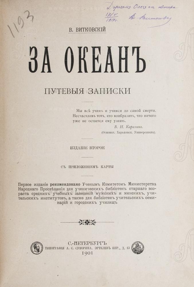Витковский, В.В. [автограф] За океан: Путевые записки: С прил. карты/ В. Витковский. — 2-е изд. — СПб: тип. А.С. Суворина, 1901. — VIII, 591 с., 1 л. карт.: ил.